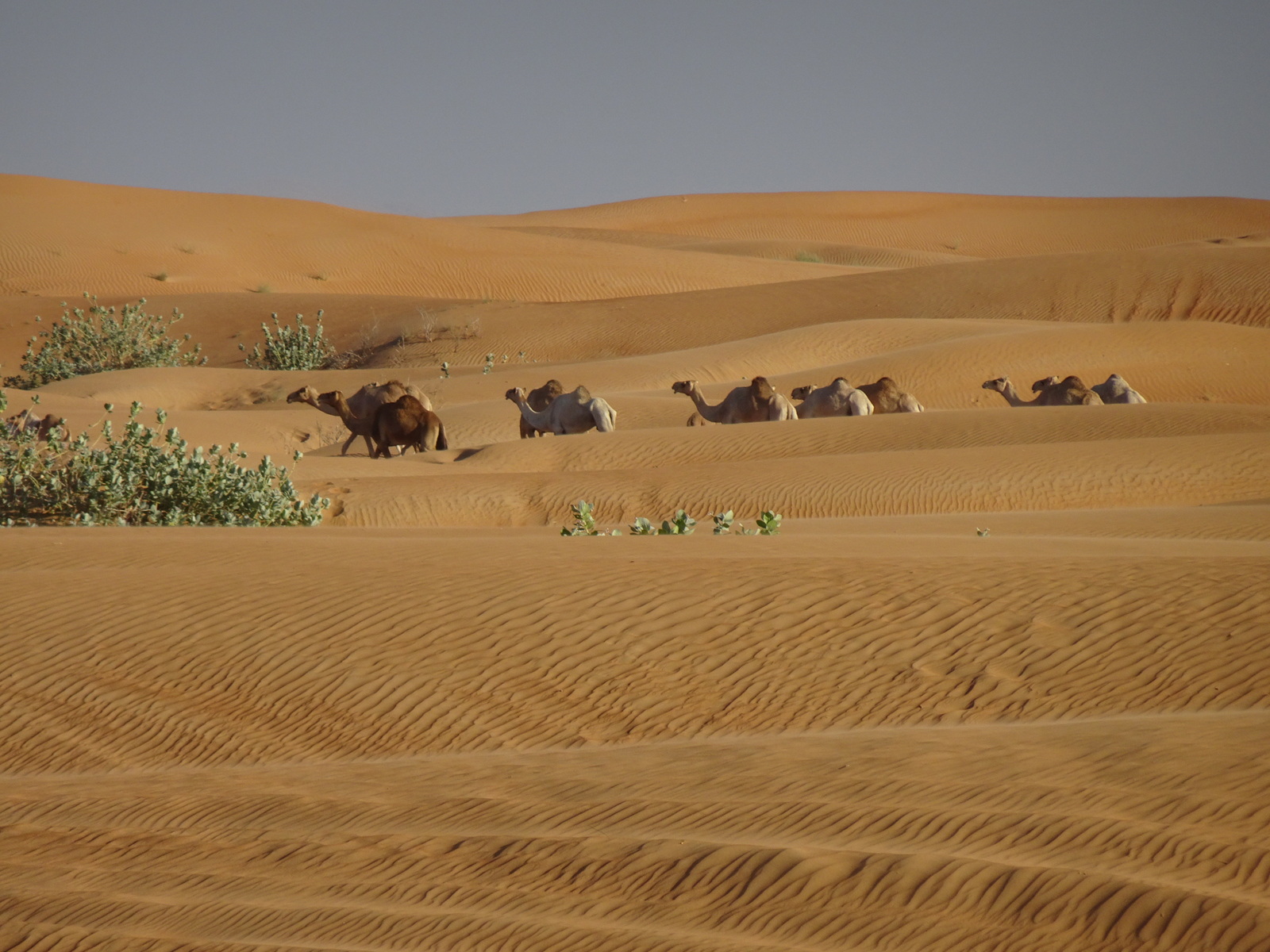 In der Ferne erkenne ich ein Kamel und dann noch mehrere. Die ziehen dort, wahrscheinlich auch zufällig…, zwischen den Dünen ihre Bahnen und verbreiten Wüstenflair. Menschen sehe ich keine und auch keine Stricke an denen die plötzlich aufgetauchten Showstars geführt werden. Aber… ich glaube, die lassen hier aber auch nichts aus, uns zu bespaßen. Egal, die Illusion ist perfekt und es kann weitergehen.