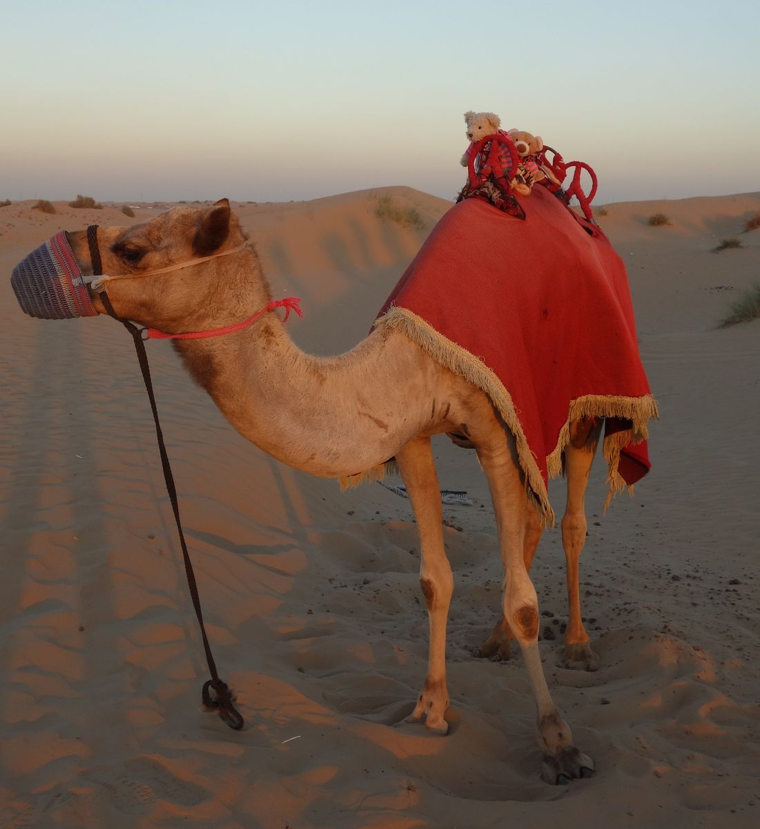 Jetzt aber, so kurz vor dem Sonnenuntergang erstmal hoch zu den Kamelen. Anders als die von eben, haben die diesmal einen Sattel und einen Strick.
