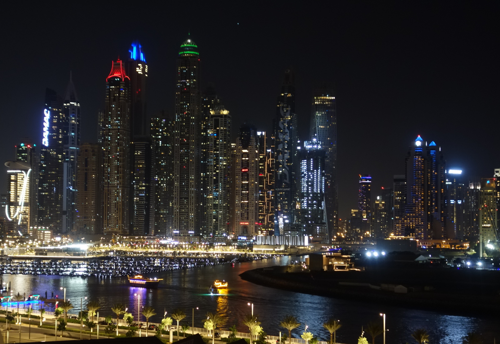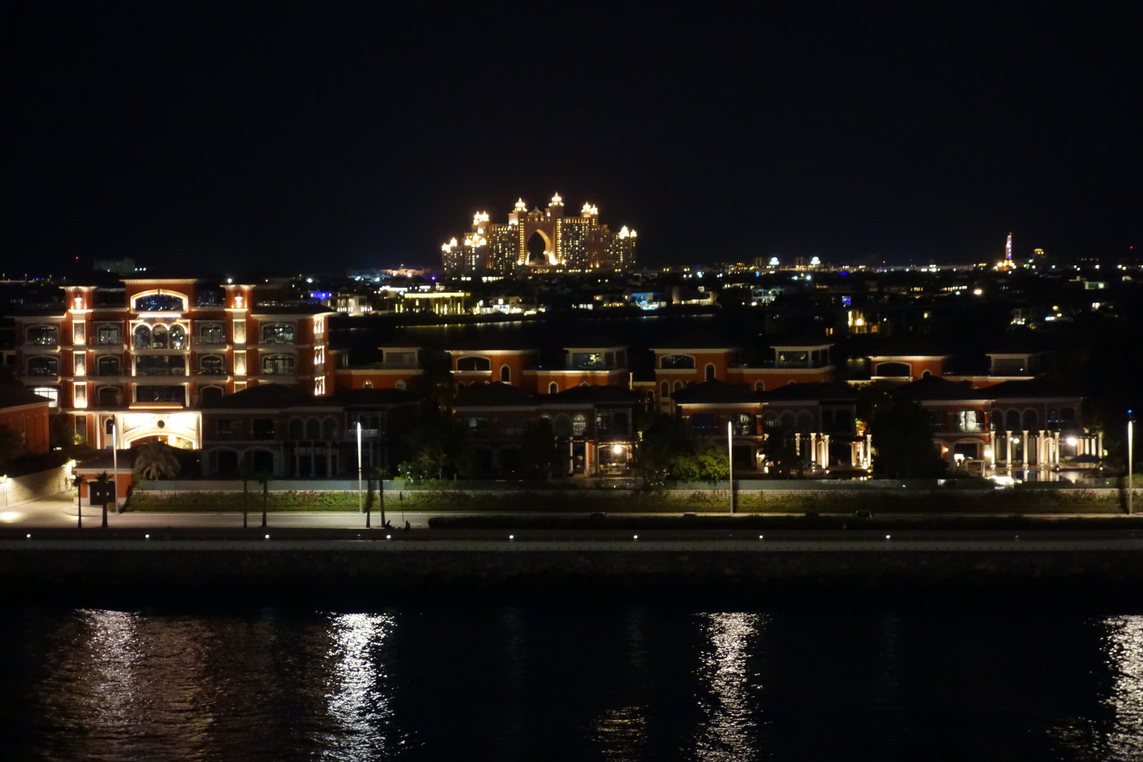 Ein langer Tag mit 2 tollen Ausflügen geht zu Ende. Noch kein Ende aber haben an der Steuerbordseite die Yachten mit ihrem optischen und akustischen Kräftemessen gefunden. Sie schwimmen noch lange die flüssige Flaniermeile auf und ab. Und in der Ferne leuchtet das Hotel Atlantis markant am Ende der künstlichen Palmeninsel.
