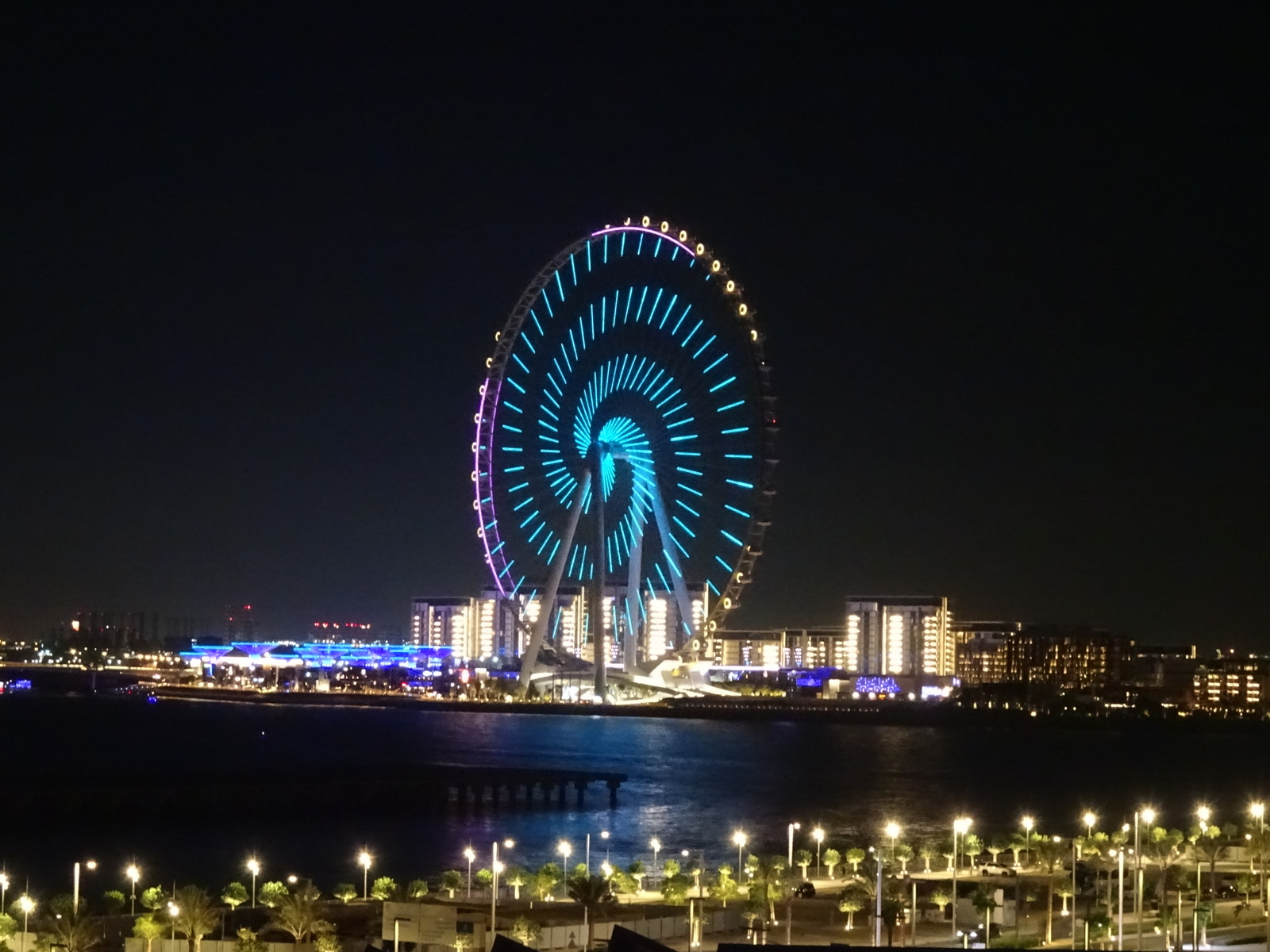 und dort hinten, aber so nah, das gigantische Riesenrad „Dubai Ain“ in immer wechselndem Farbenspiel.