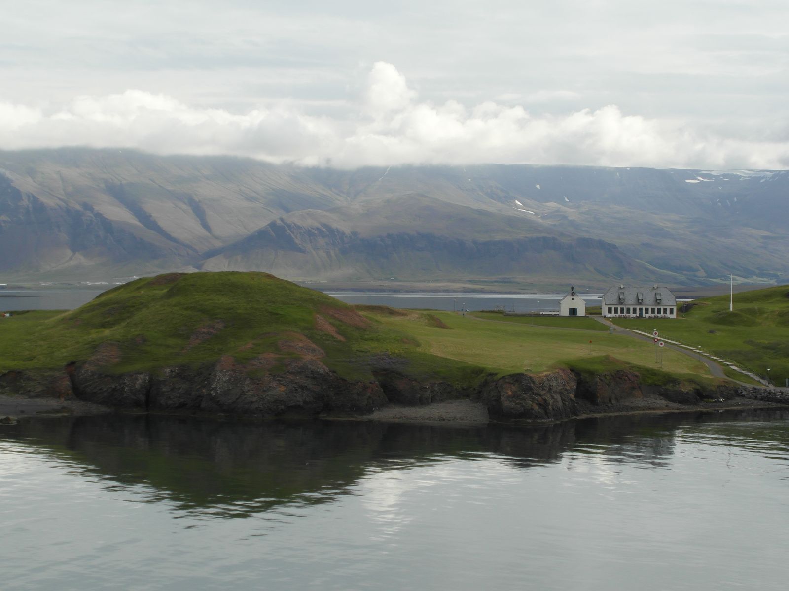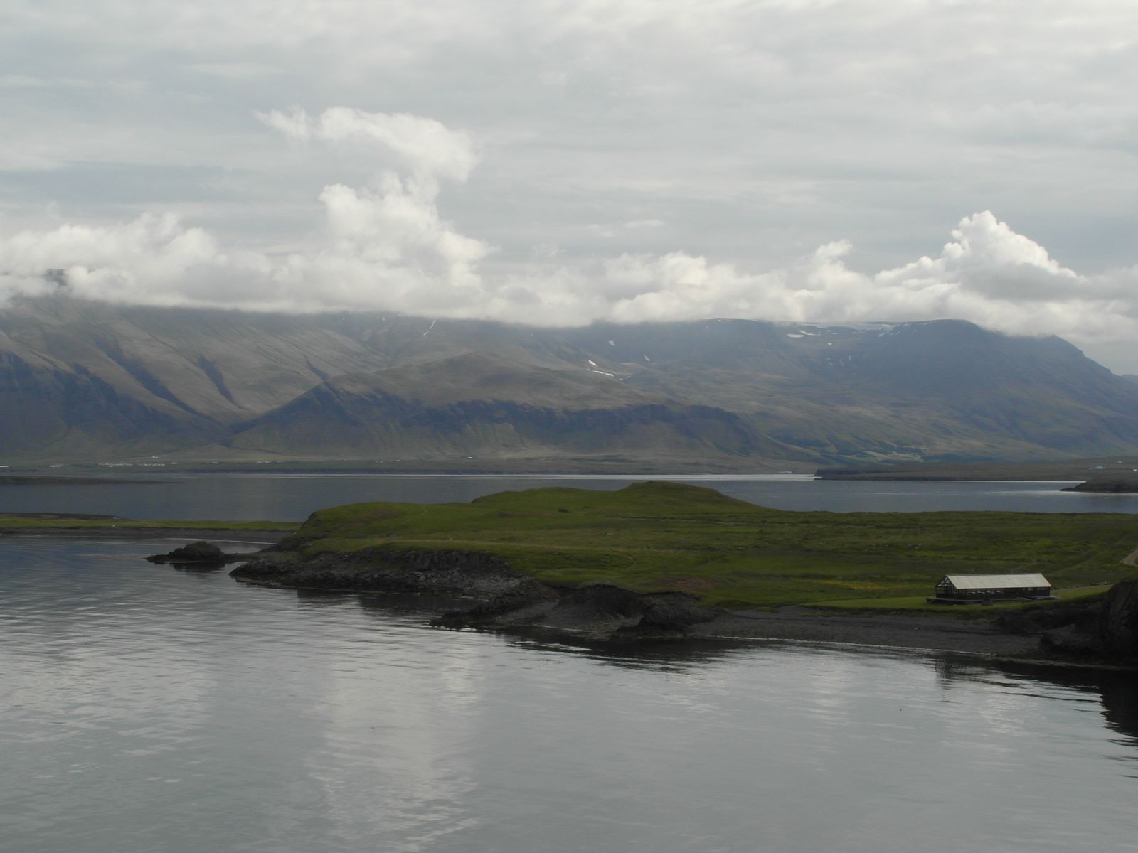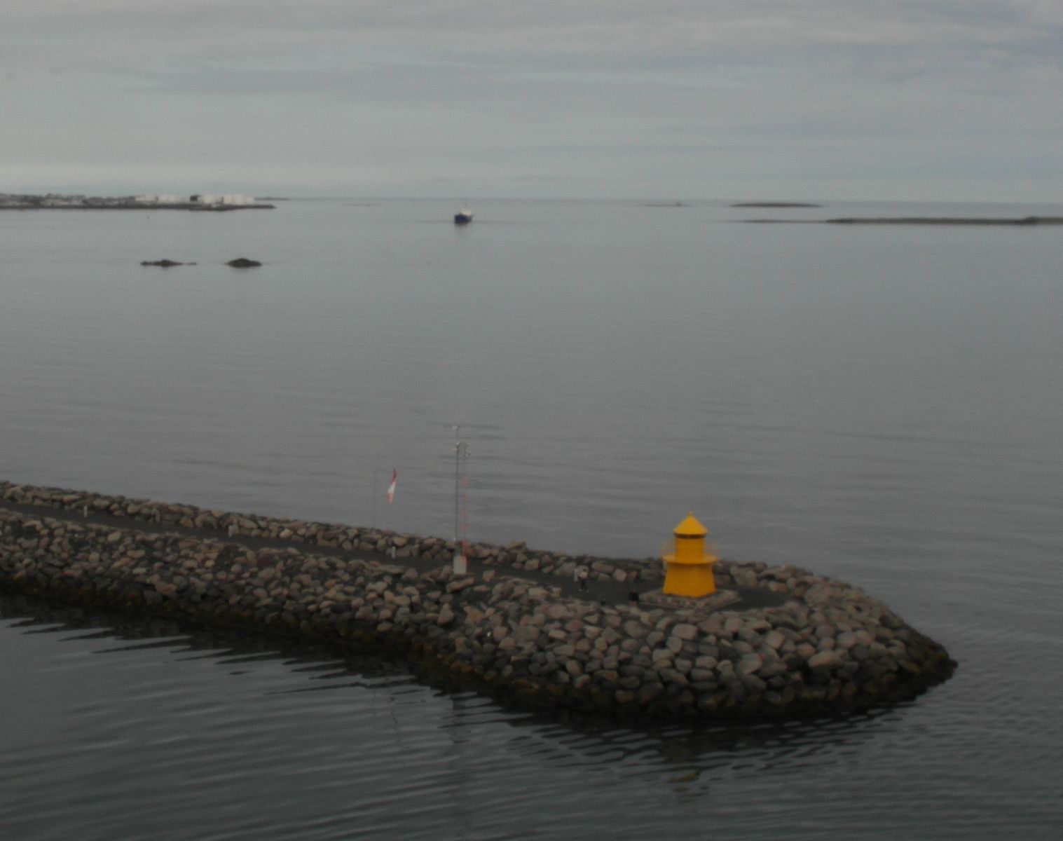 Einladend sah der Himmel nicht aus. Aber es war trocken. Natürlich stand ich bereits an Deck, als die ersten Ausläufer Islands in Sicht kamen.