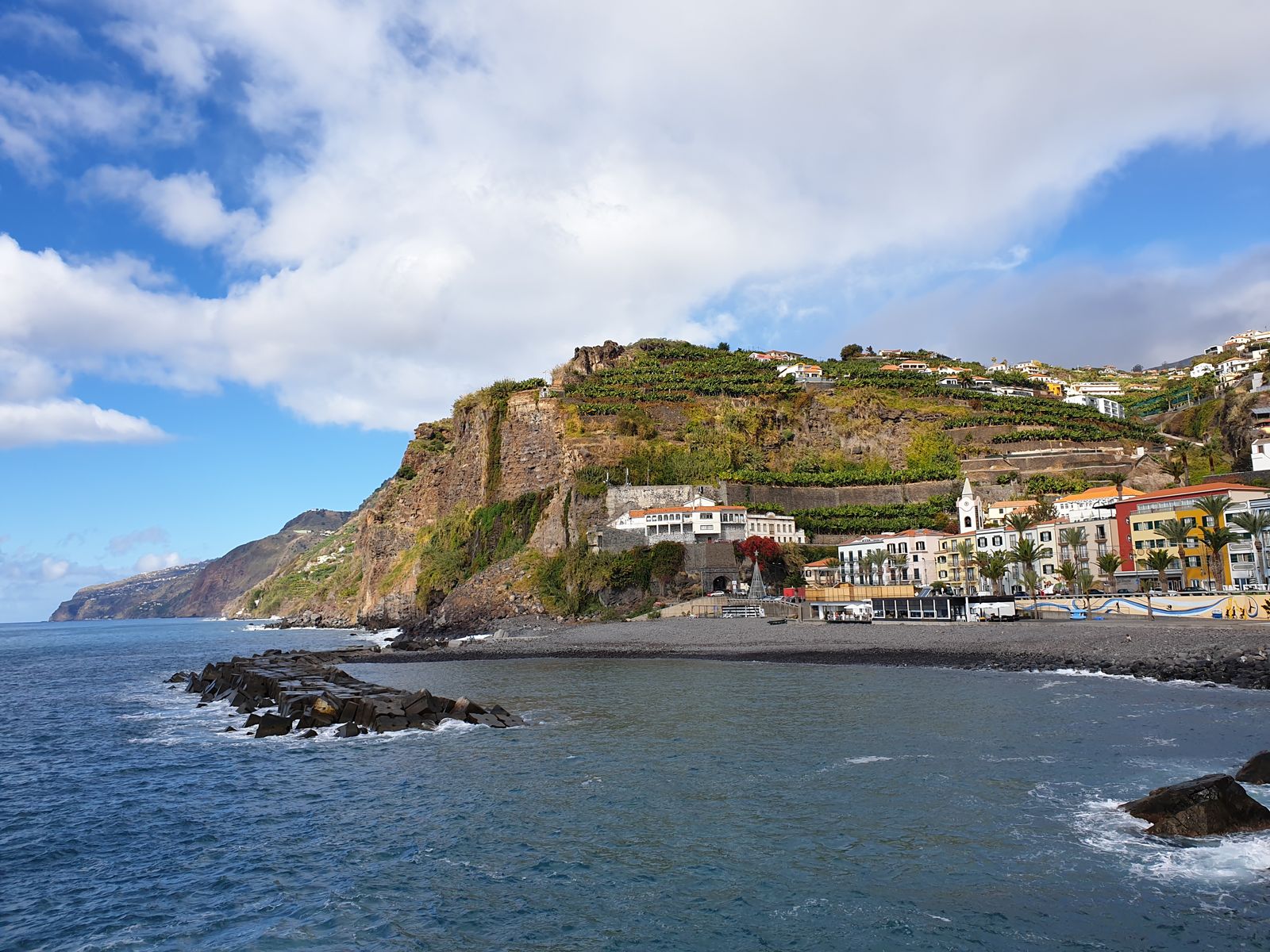 Kurz erklärt er uns, wo es hin geht und starten den heutigen Ausflug in die entgegengesetzte Richtung der Insel. Stadtauswärts, entlang der Küste nach Südwesten, vorbei an Bananenplantagen und dem wohl wichtigsten Anbaugebiet für den Madeirawein, erreichen wir das erste Ziel. Am Ortsanfang von Camara de Lobos steigen wir zwei aus und laufen zur Ortsmitte. Die portugiesische Stadt besticht durch einen schönen Ortskern und einem kleinen malerischen Fischereihafen. Die bunten Boote liegen auf dem Kai, darüber entdecke ich flache Häuser und den ganzen Berg hoch wachsen Bananenstauden. Welch ein Anblick auch.