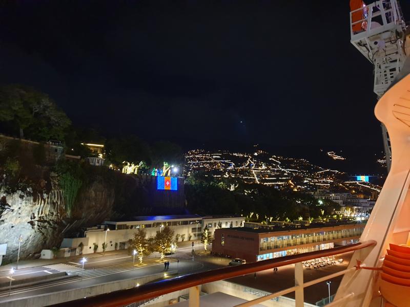 Oben auf dem Pooldeck drehen wir noch eine Runde und schauen auf die bunt erleuchtete Inselhauptstadt, bevor wir den legendären Poncha trinken. Ja, er schmeckt wirklich lecker und findet auch reißenden Absatz.
