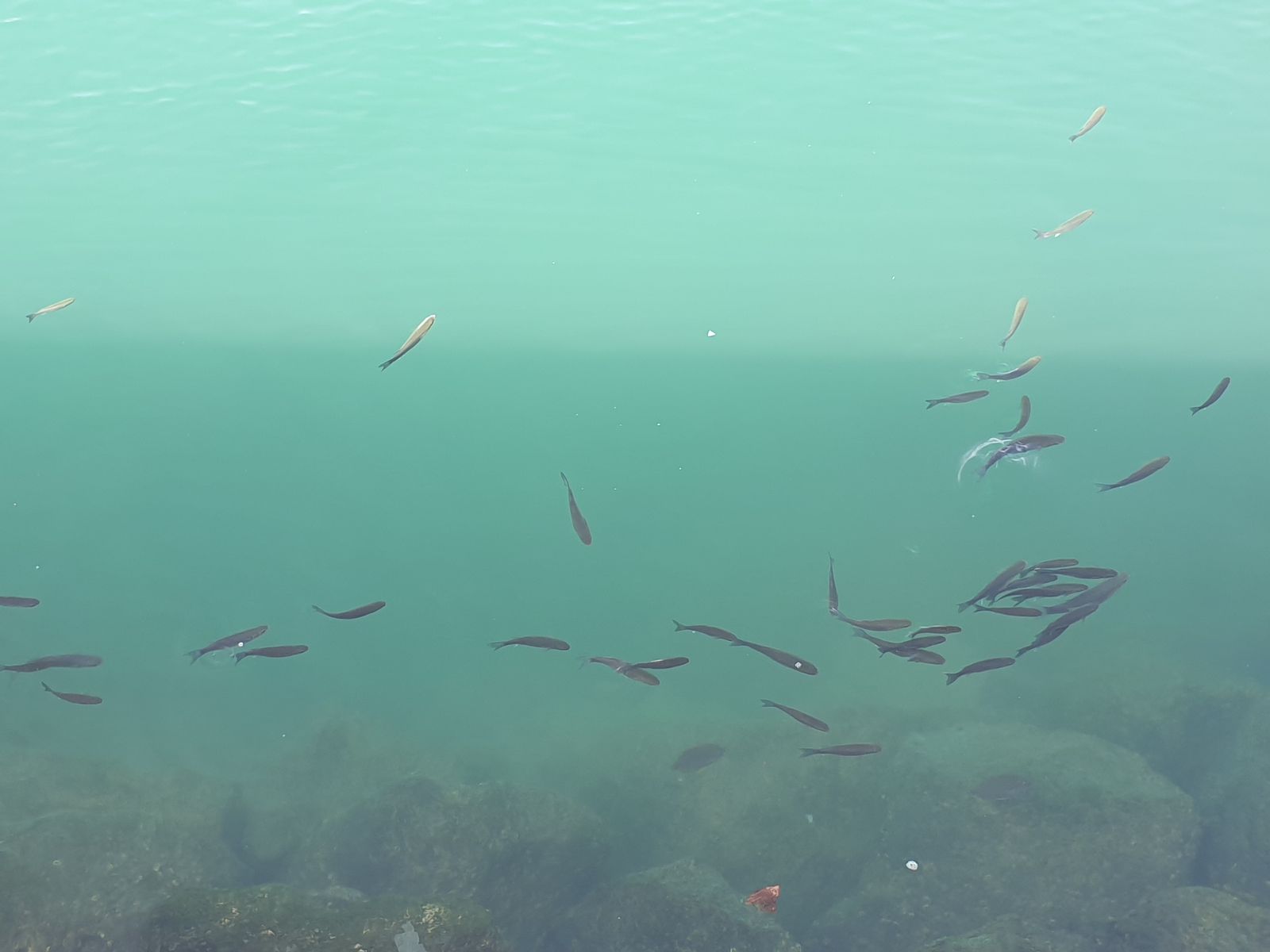 Im Jachthafen liegen Boote still auf dem Wasser und an einer Stelle können wir kleine Fischschwärme beobachten.