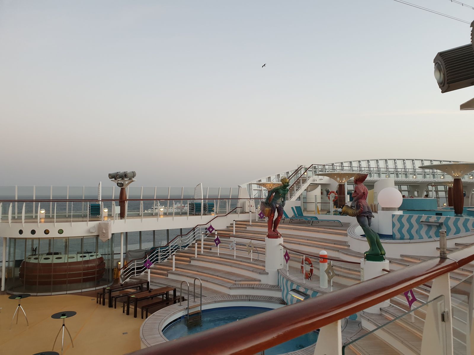 So richtig ausschlafen tut gut, Frühstück verpasst. Das ist nicht tragisch, denn es gibt ja bald Mittagessen. Den Nachmittag verbringen wir gemütlich auf einer Liege, die Sonne scheint auf das Pooldeck, einfach herrlich.