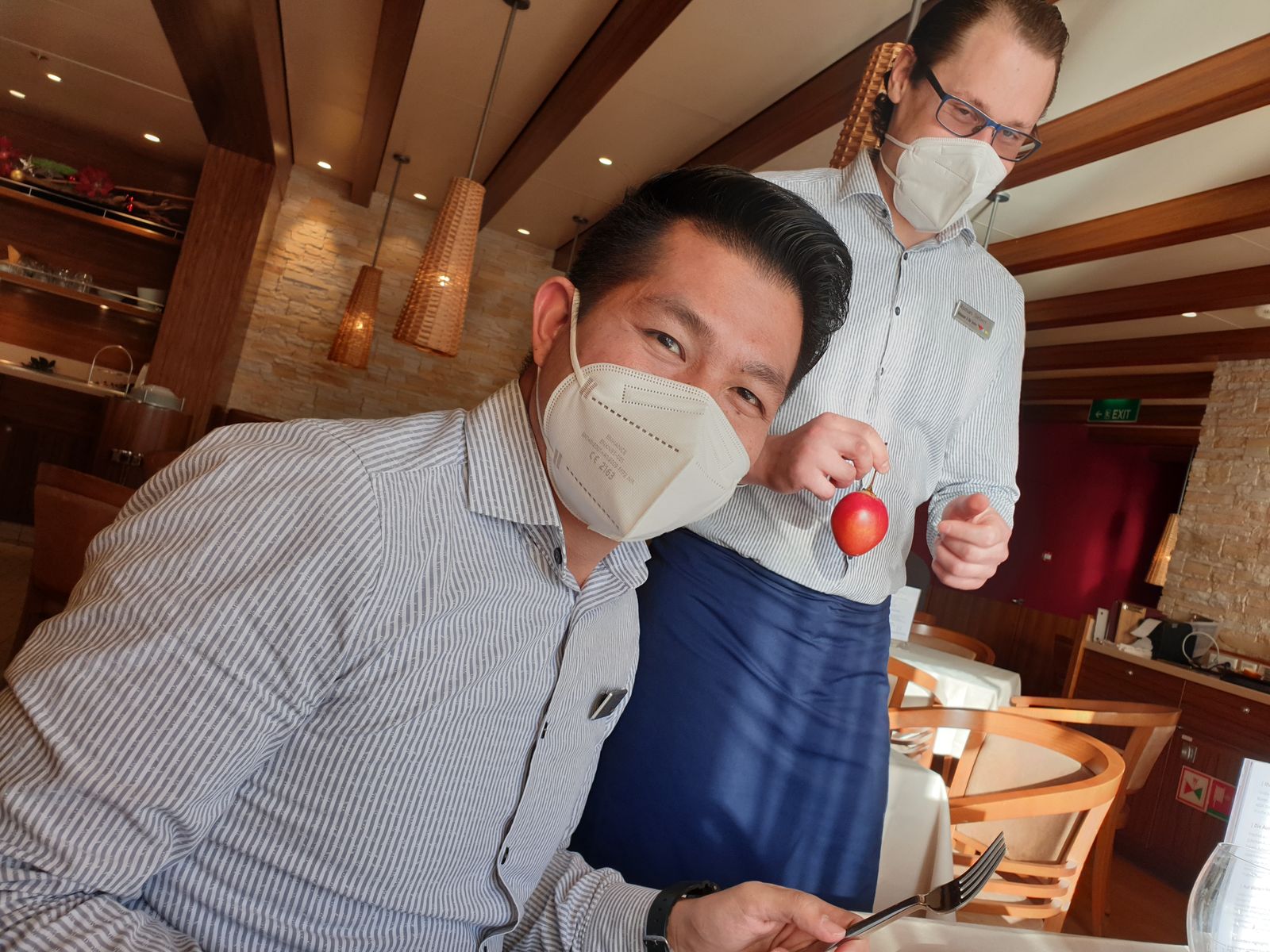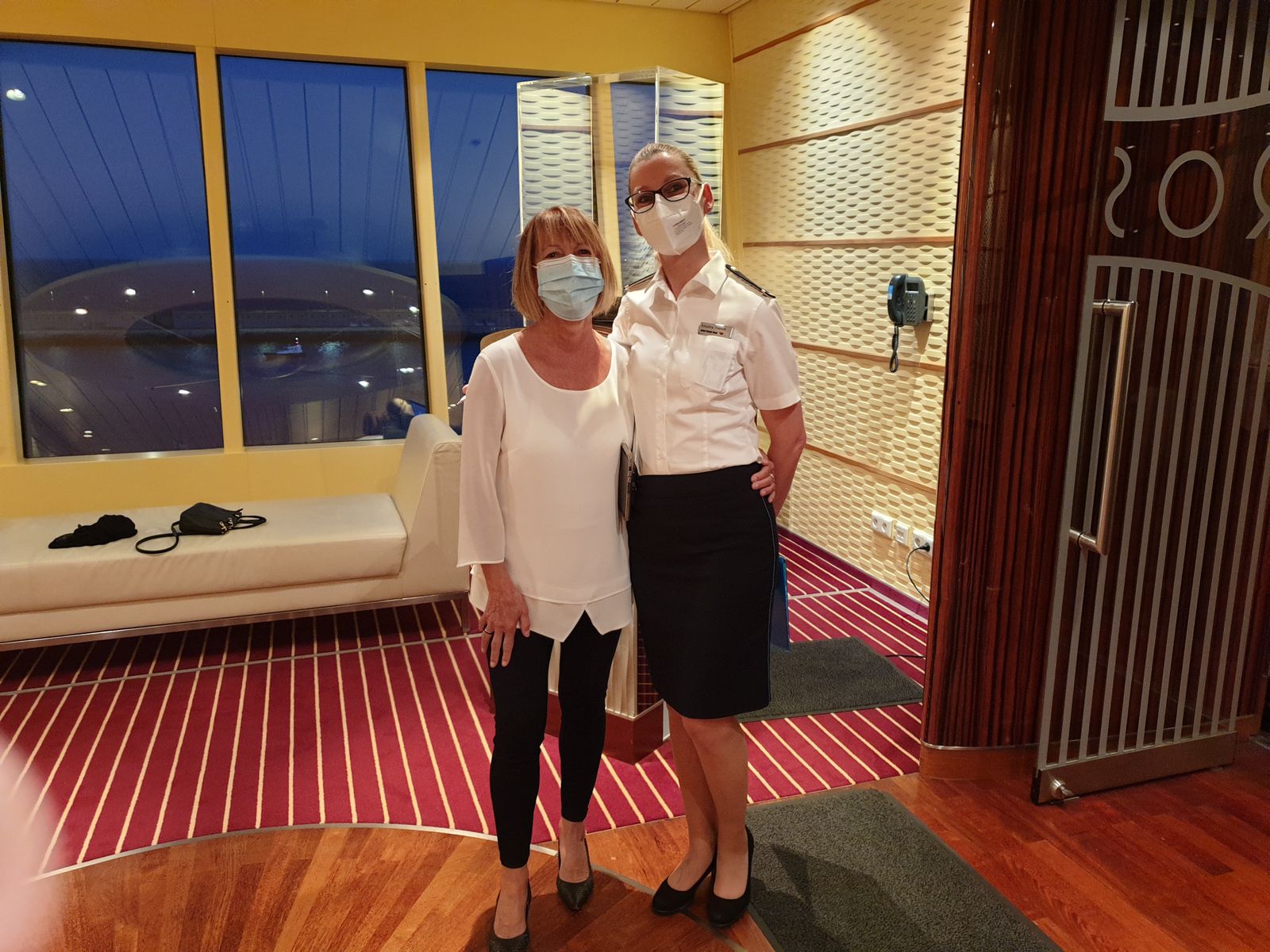 Pünktlich schaffen wir es nach dem Essen um halb zehn auf das Pooldeck. Entertainment Manager Niels und Hotel Direktor Morton Junior verabschieden sich von uns Gästen, es gibt die Lasershow und dann wird es Zeit einen kleinen Abstecher zur Poolbar zu machen. Der Crew dort bye bye zu sagen. Es war eine schöne Zeit mit ihnen und ich hoffe und wünsche, sie bleiben gesund und Luna kann bald ihren kleinen Sohn in die Arme schließen. Sie hat bald Heimaturlaub – nach Monaten.