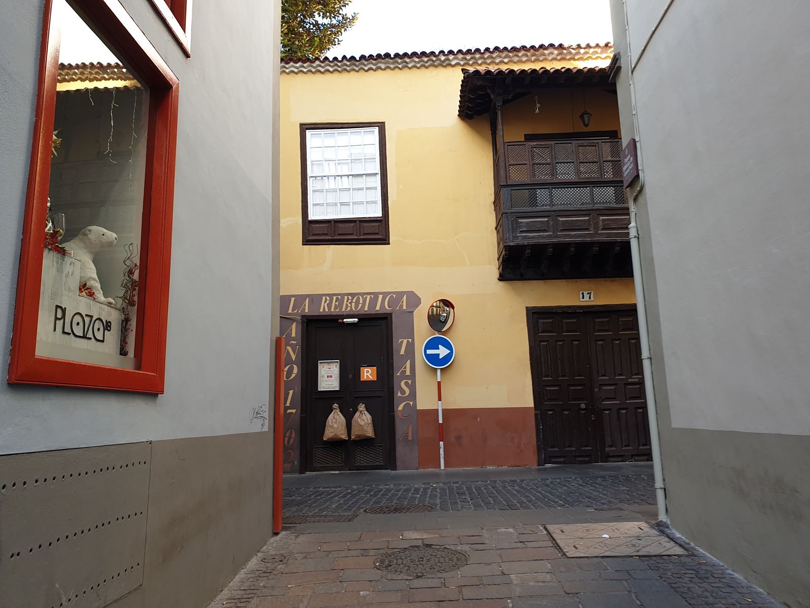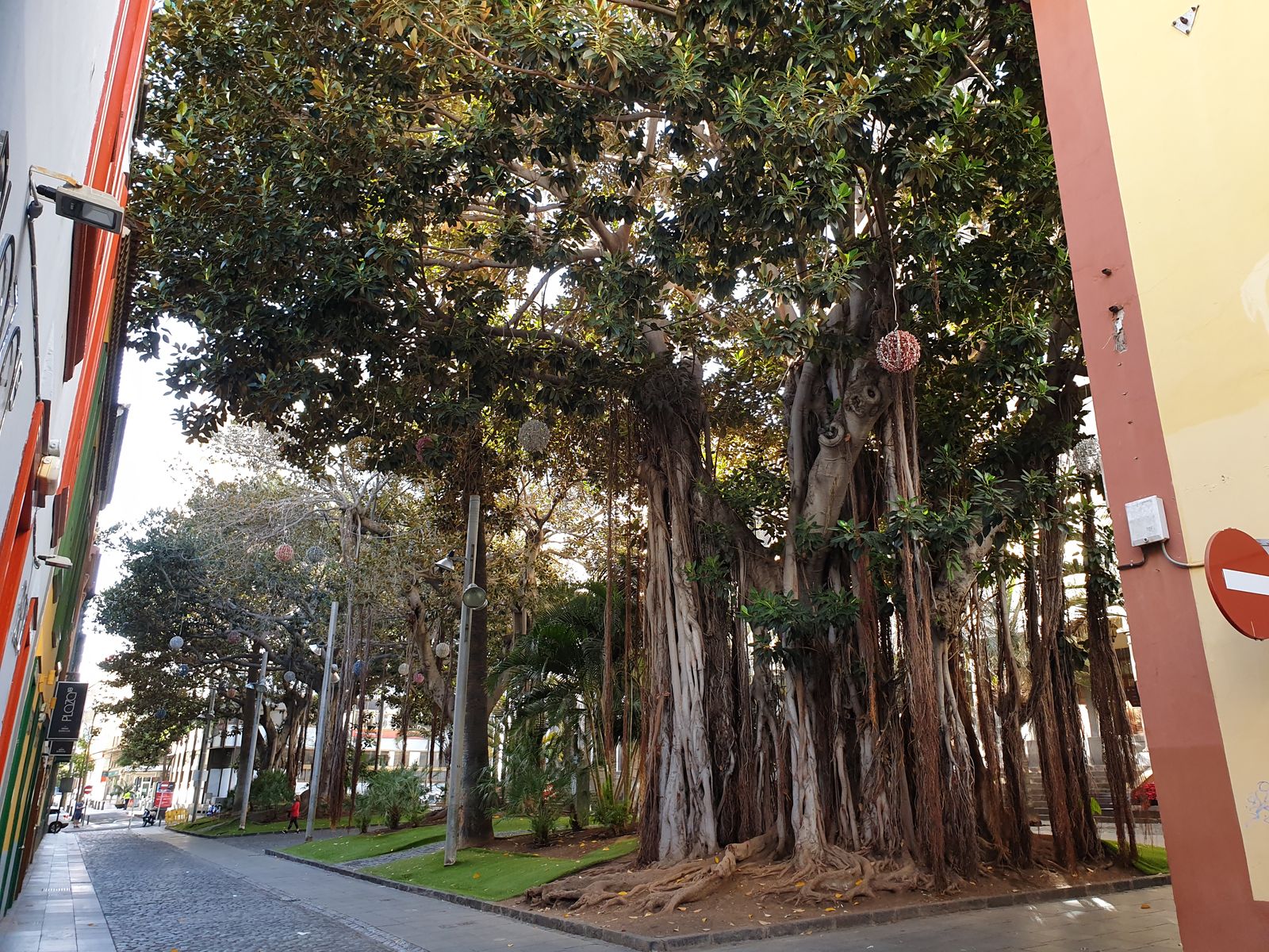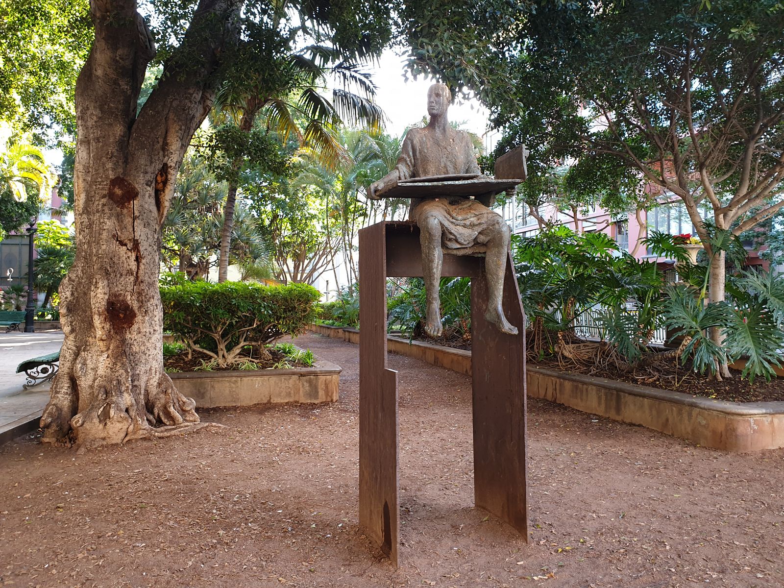Ein paar Meter weiter stoßen wir auf den Plaza de Principal mit den hohen Bäumen. Wir umrunden ihn, ich fotografiere nochmal das Tribunal Superior des Justicia de Canaris, sprich ein Gerichtsgebäude.