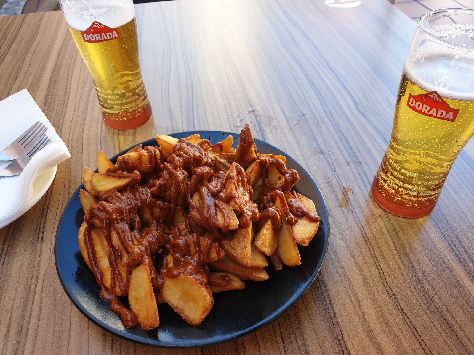 Das würde ich wohl nicht essen wollen, erinnert mich an eine Schlange. Beim Restaurant im Innenhof müssen wir anstehen, der Andrang ist groß – aber mit etwas Glück, bekommen wir nach einer Weile einen Tisch zugeteilt und die Bestellung ist fix aufgegeben. Wieder eine Portion Patatas bravo und zwei kleine Bier dazu.