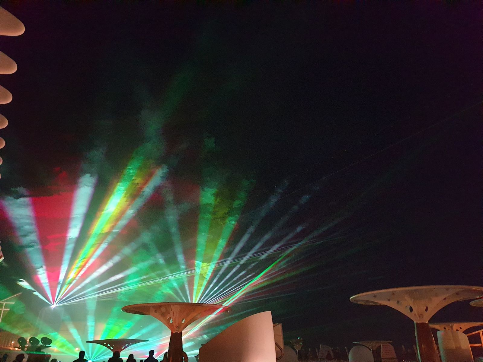 Pünktlich schaffen wir es nach dem Essen um halb zehn auf das Pooldeck. Entertainment Manager Niels und Hotel Direktor Morton Junior verabschieden sich von uns Gästen, es gibt die Lasershow und dann wird es Zeit einen kleinen Abstecher zur Poolbar zu machen. Der Crew dort bye bye zu sagen. Es war eine schöne Zeit mit ihnen und ich hoffe und wünsche, sie bleiben gesund und Luna kann bald ihren kleinen Sohn in die Arme schließen. Sie hat bald Heimaturlaub – nach Monaten.