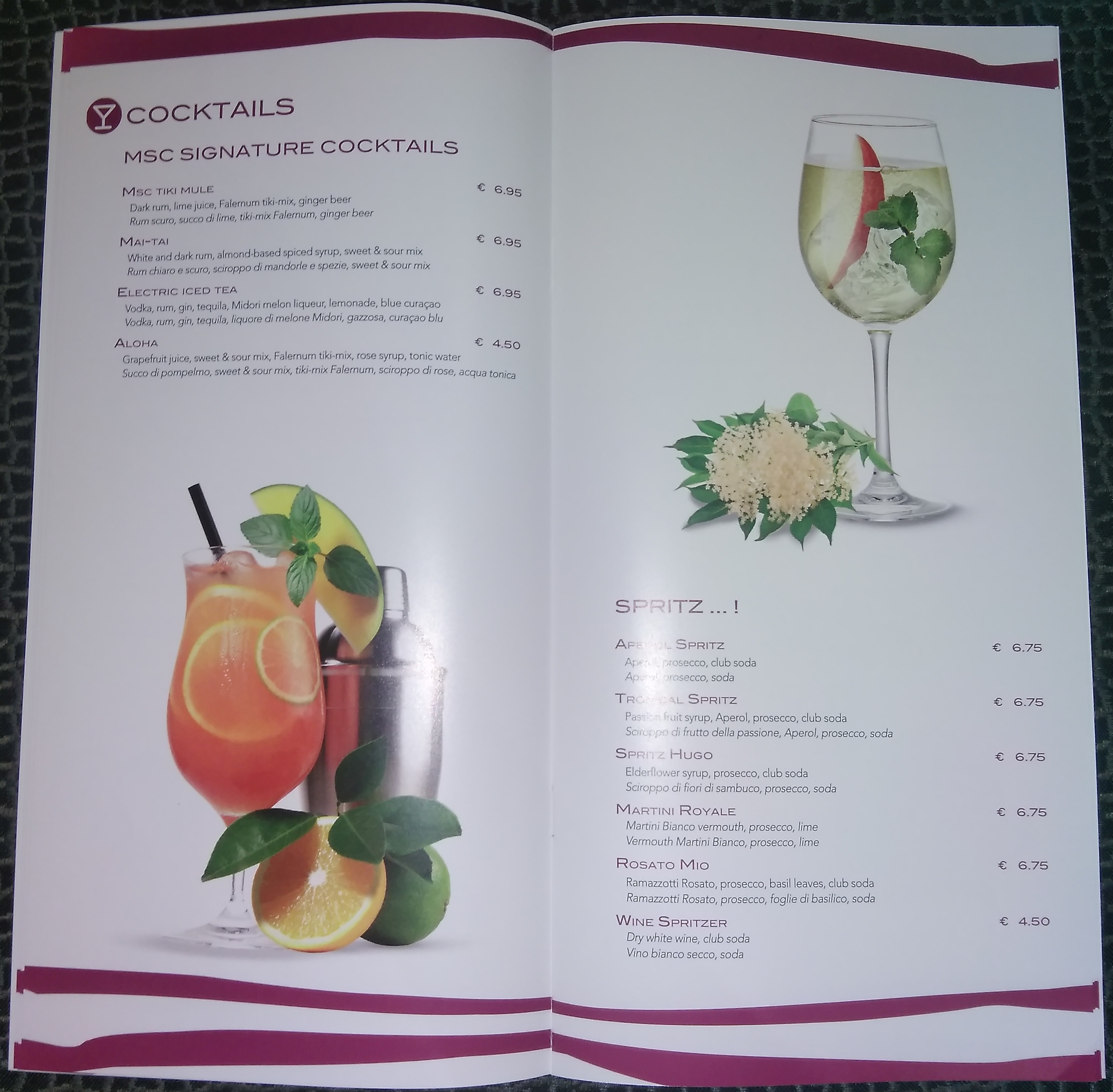 Seit dem 23.04.2017 gibt es auf der MSC Splendida eine neue Getränkekarte in den Bars. Die Preise wurden in dem Zuge teilweise leicht erhöht. Bei den Kids Cocktails wurde der "Alice in Wonderland" aus der Karte gestrichen. Bestellen konnte man ihn am 23.04. an der Bar (zum alten Preis von 4,20 Euro) aber noch. Wie lange das noch möglich ist kann ich nicht sagen. Es kann sein, dass auch noch mehr Getränke gestrichen wurden oder neue dazu gekommen sind. Da ich die alte Karte nicht habe, kann ich dazu aber leider nichts sagen.