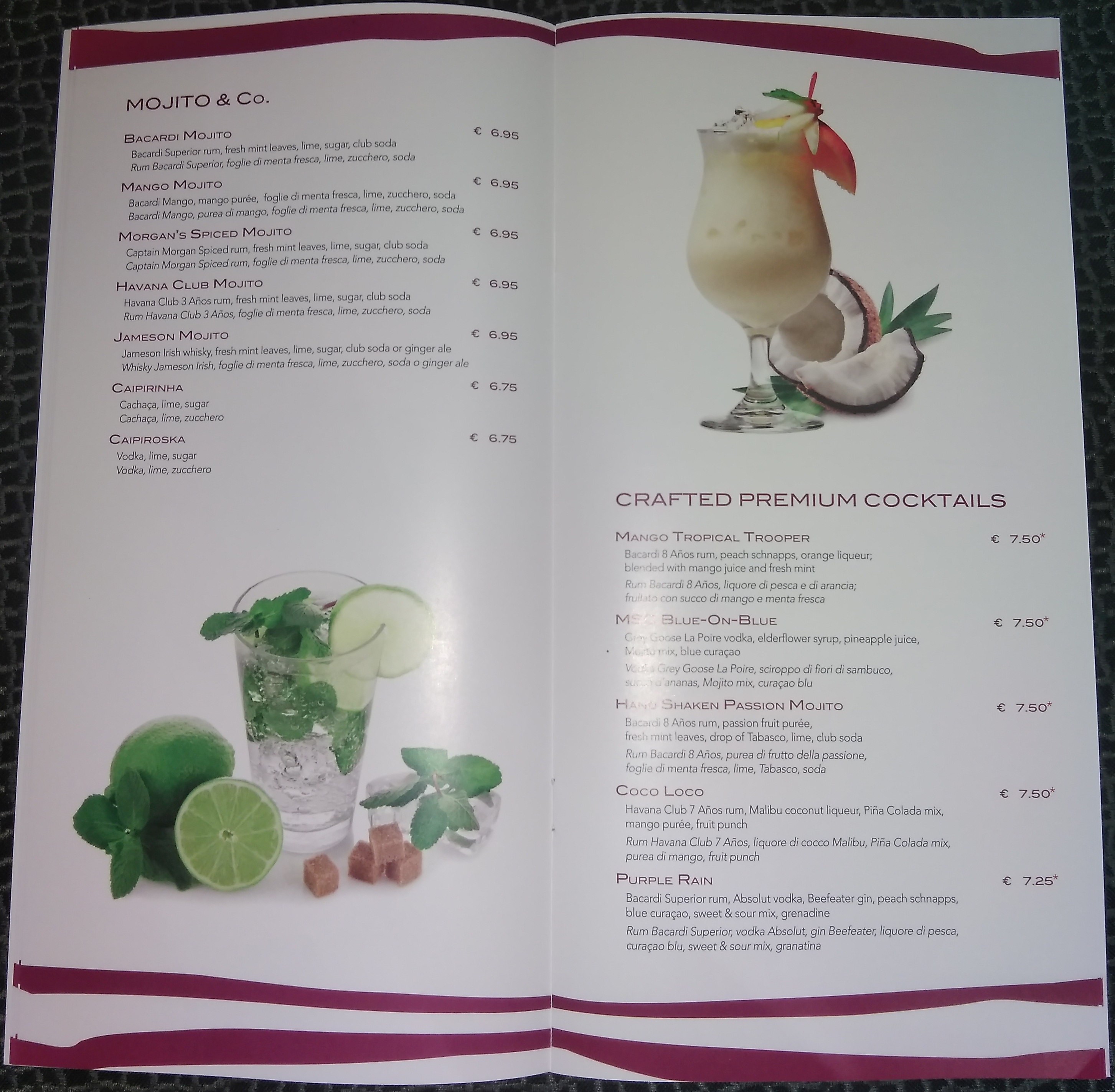 Seit dem 23.04.2017 gibt es auf der MSC Splendida eine neue Getränkekarte in den Bars. Die Preise wurden in dem Zuge teilweise leicht erhöht. Bei den Kids Cocktails wurde der "Alice in Wonderland" aus der Karte gestrichen. Bestellen konnte man ihn am 23.04. an der Bar (zum alten Preis von 4,20 Euro) aber noch. Wie lange das noch möglich ist kann ich nicht sagen. Es kann sein, dass auch noch mehr Getränke gestrichen wurden oder neue dazu gekommen sind. Da ich die alte Karte nicht habe, kann ich dazu aber leider nichts sagen.