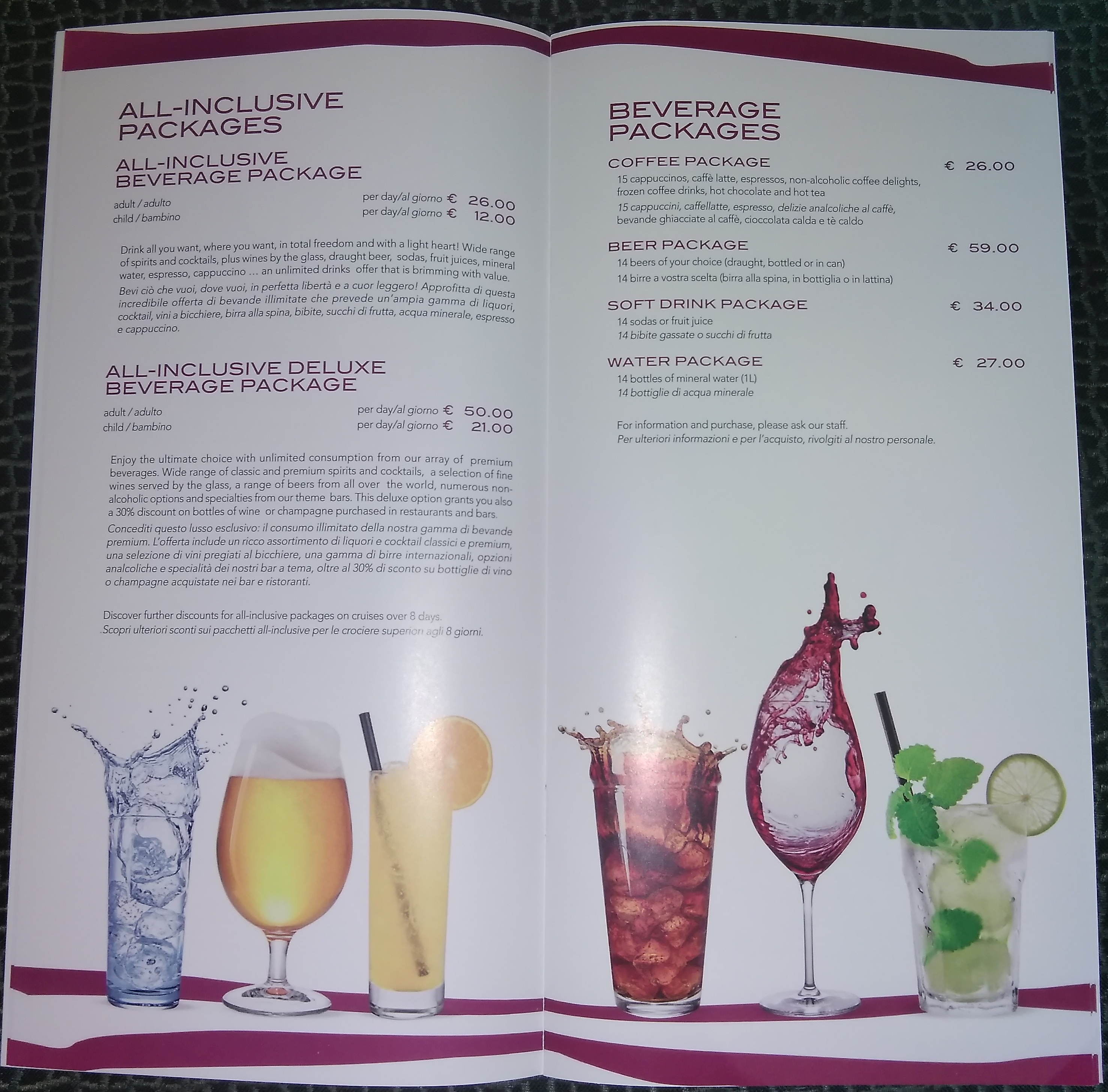 Seit dem 23.04.2017 gibt es auf der MSC Splendida eine neue Getränkekarte in den Bars. Die Preise wurden in dem Zuge teilweise leicht erhöht. Bei den Kids Cocktails wurde der "Alice in Wonderland" aus der Karte gestrichen. Bestellen konnte man ihn am 23.04. an der Bar (zum alten Preis von 4,20 Euro) aber noch. Wie lange das noch möglich ist kann ich nicht sagen. Es kann sein, dass auch noch mehr Getränke gestrichen wurden oder neue dazu gekommen sind. Da ich die alte Karte nicht habe, kann ich dazu aber leider nichts sagen.
