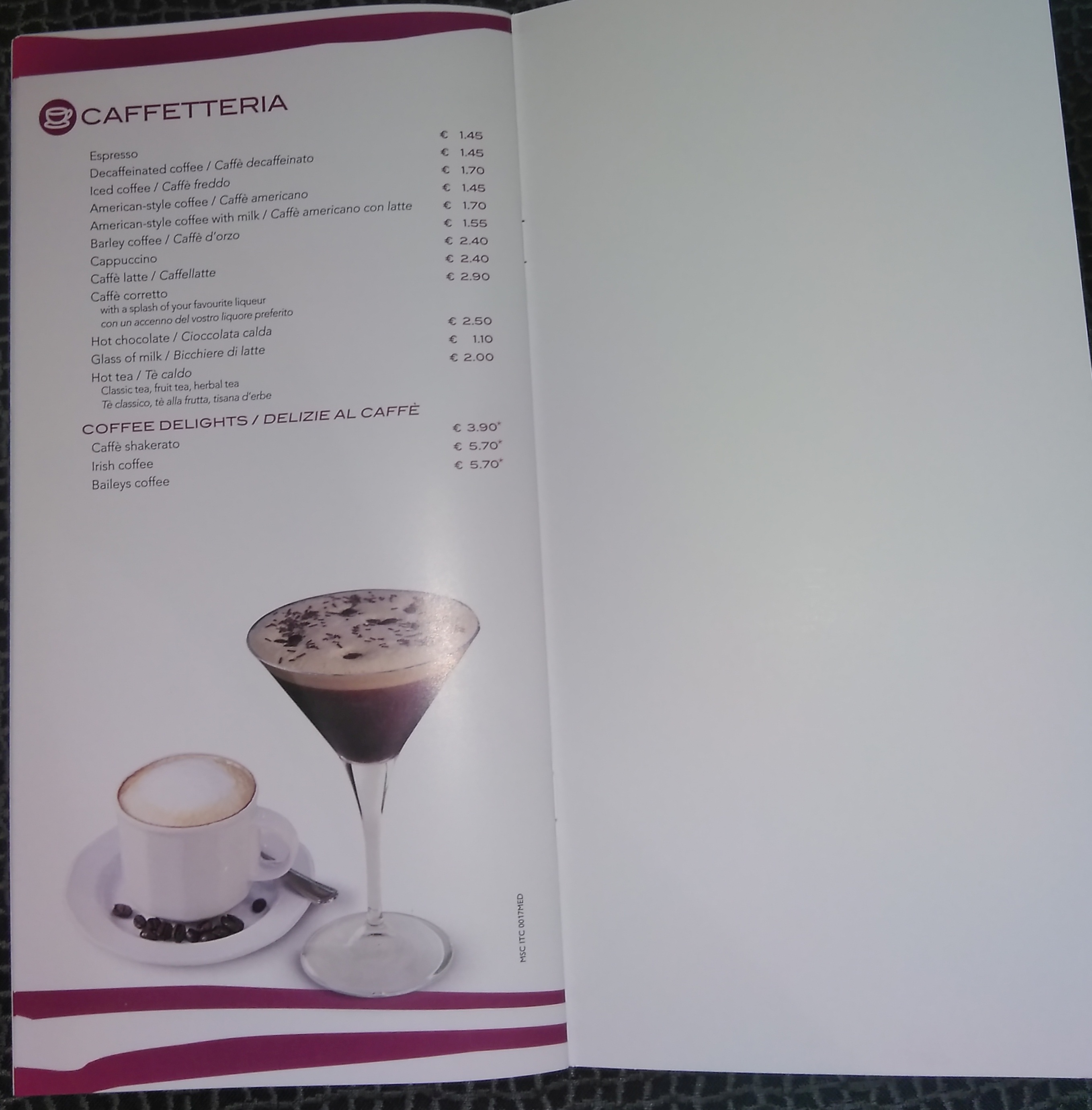 Seit dem 23.04.2017 gibt es auf der MSC Splendida eine neue Getränkekarte in den Bars. Die Preise wurden in dem Zuge teilweise leicht erhöht. Bei den Kids Cocktails wurde der "Alice in Wonderland" aus der Karte gestrichen. Bestellen konnte man ihn am 23.04. an der Bar (zum alten Preis von 4,20 Euro) aber noch. Wie lange das noch möglich ist kann ich nicht sagen. Es kann sein, dass auch noch mehr Getränke gestrichen wurden oder neue dazu gekommen sind. Da ich die alte Karte nicht habe, kann ich dazu aber leider nichts sagen.