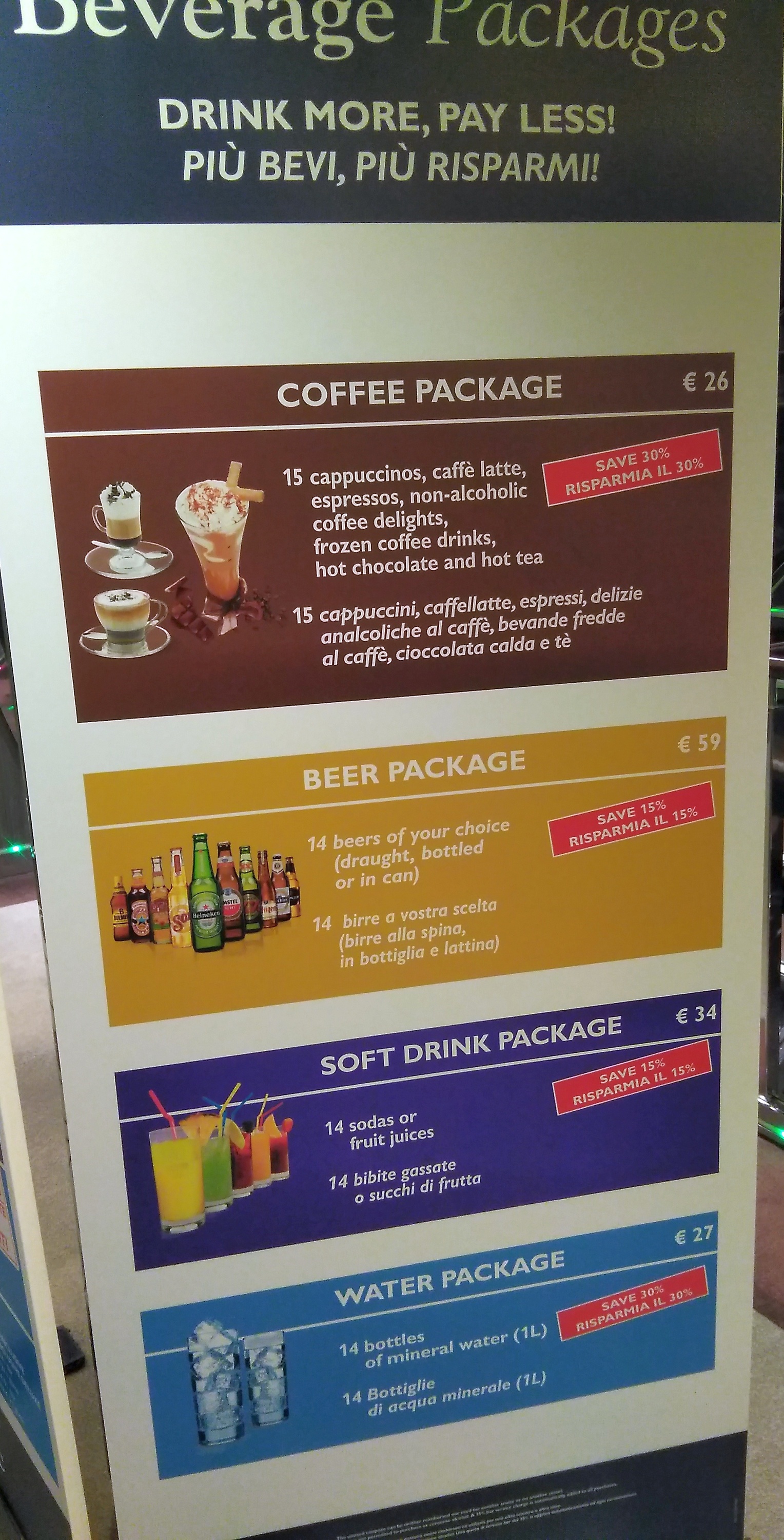 Aufsteller, der MSC Getränkepakete 2017, die an Bord buchbar sind. Ab dem 23.04.2017 auf der MSC Splendida in leicht veränderter Form. Das "Draught Beer Package (58 €)" und das "Bottled Beer Package (59 €)" wurden zum "Beer Package (59 €)" zusammengefasst und das "Doremi Package (30 € für 10 Alkoholfreie Cocktails, Smoothies, Milchshakes, Soft Drinks oder Säfte + MSC Souvenir Becher)" wird nicht mehr aufgeführt. Ob man es auf Nachfrage trotzdem noch bekommt, kann ich nicht sagen. Es wäre schade, wenn es komplett gestrichen würde.