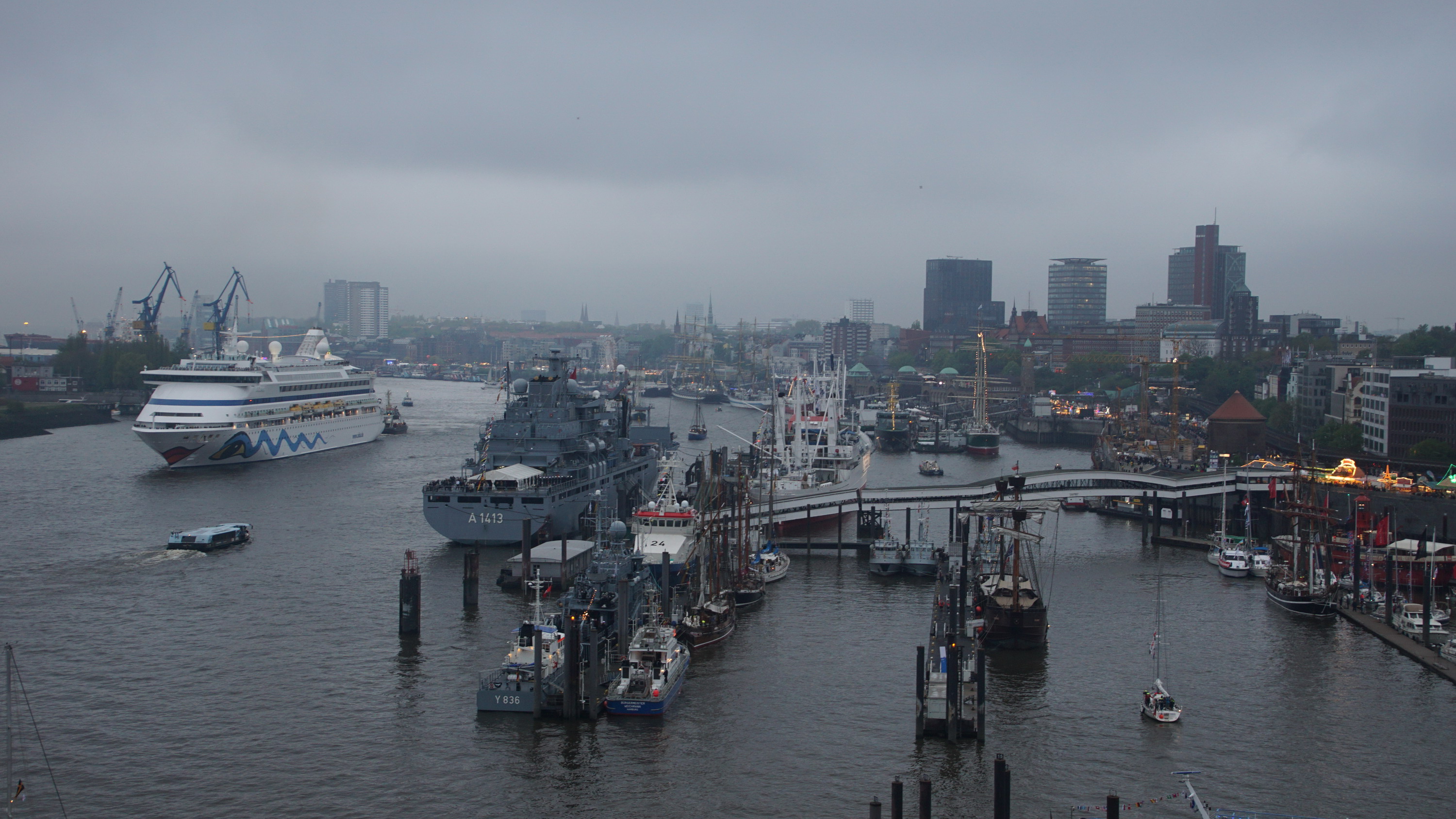 AIDAvita lag tagsüber in Steinwerder. Aus Anlass des 828. Hamburger Hafengeburtstags drehte sie nach dem Ablegen noch eine Runde durch den Hamburger Hafen.