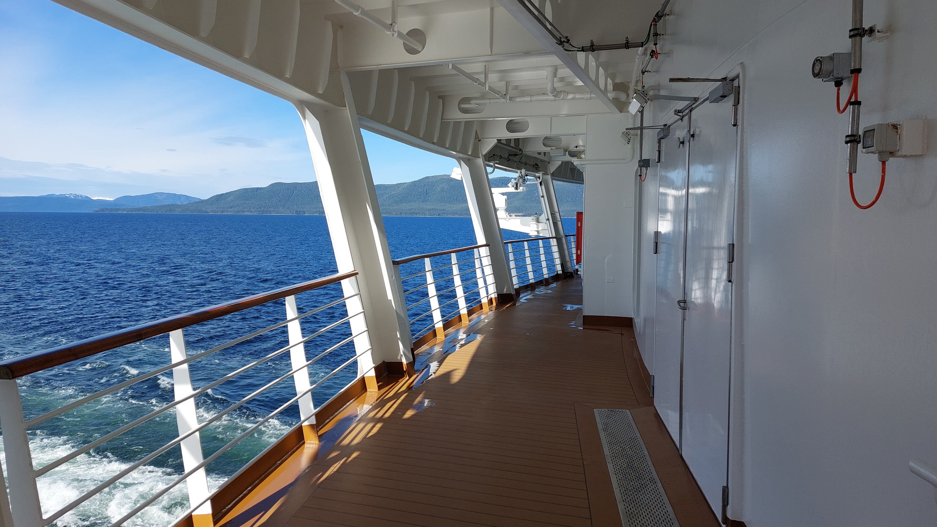 Eine meiner Lieblingsorte auf der Koningsdam: das Promenadendeck. Auf Deck 3 gelegen ist man dem Meer wirklich nach und kann einmal um das Schiff herum gehen. In der Mitte des Schiffes wird zwar der Blick durch die Rettungsboote was versperrt, davor und danach hat man aber einen wunderbaren Ausblick.
