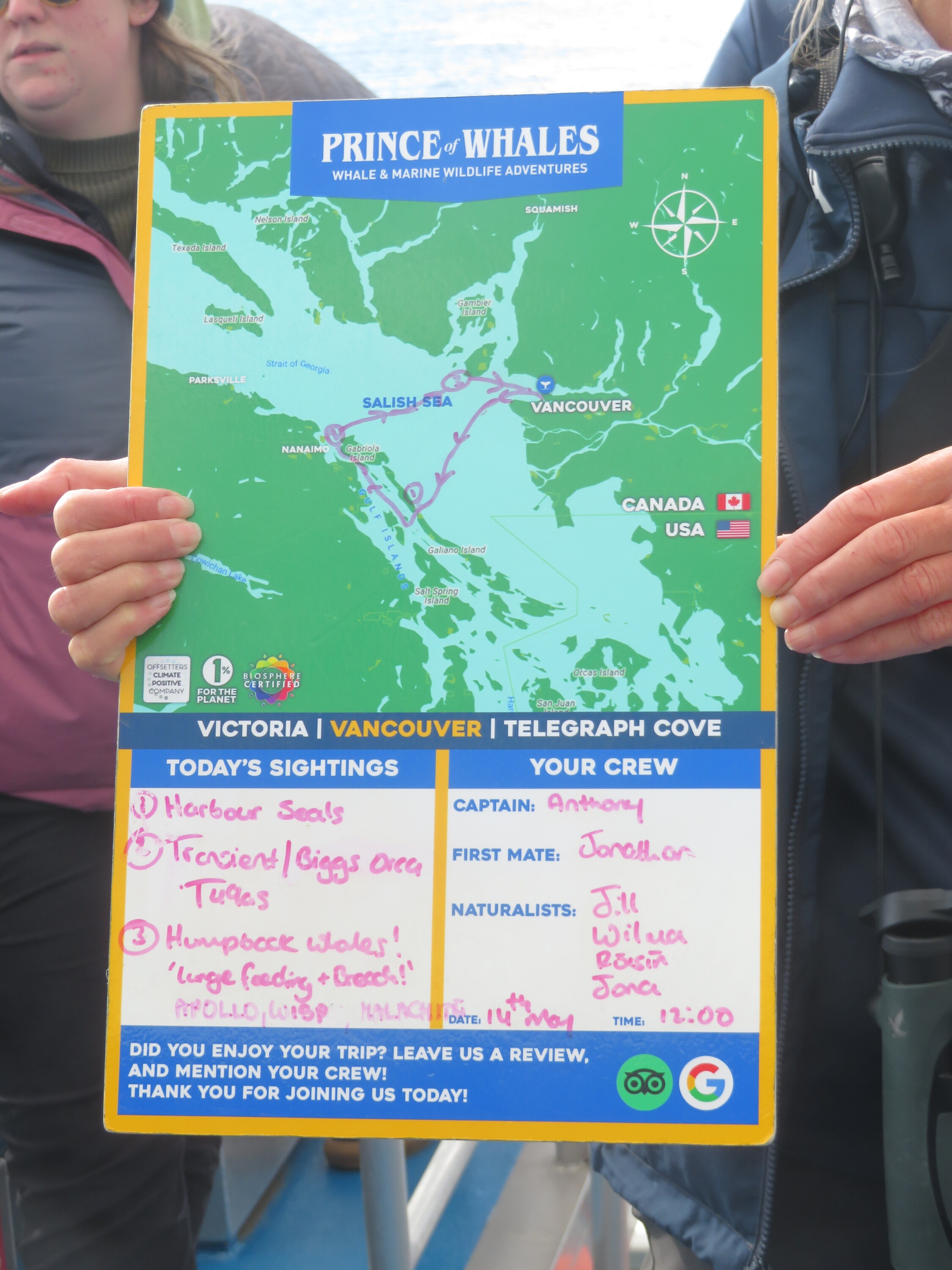Die Route die wir beim Whale Whatching gefahren sind, dazu hat die Crew notiert welche "Begegnungen" wir hatten