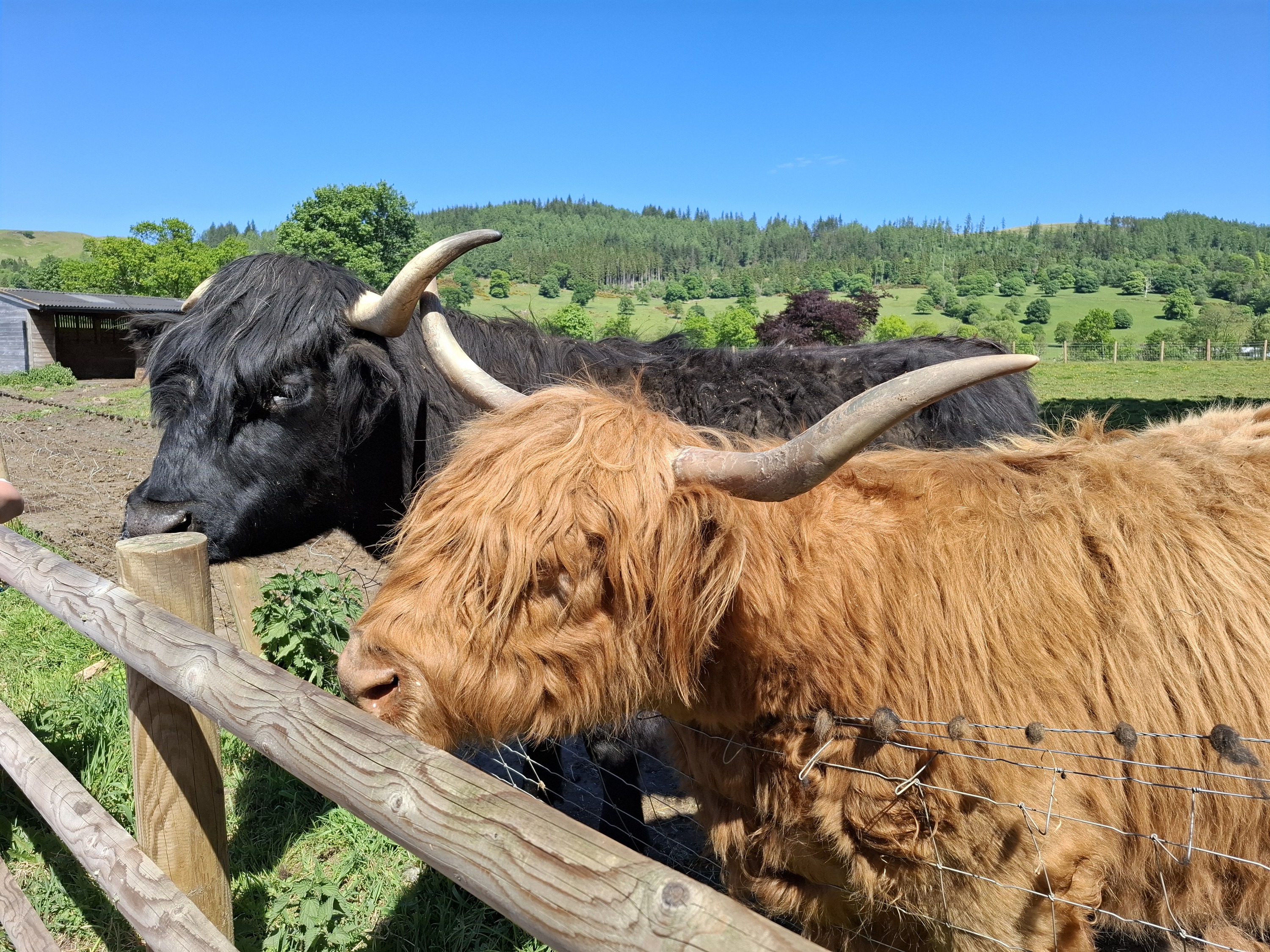 Unterwegs stoppten wir bei der Trossachs Woollen Mill. Gleich dort am Parkplatz waren einige Highland Rinder auf ihrer Weide zu bewundern. Wir sollten ihnen aber nicht zu nahe kommen ... die prächtigen Hörner hatten schon eine tolle "Spannweite"