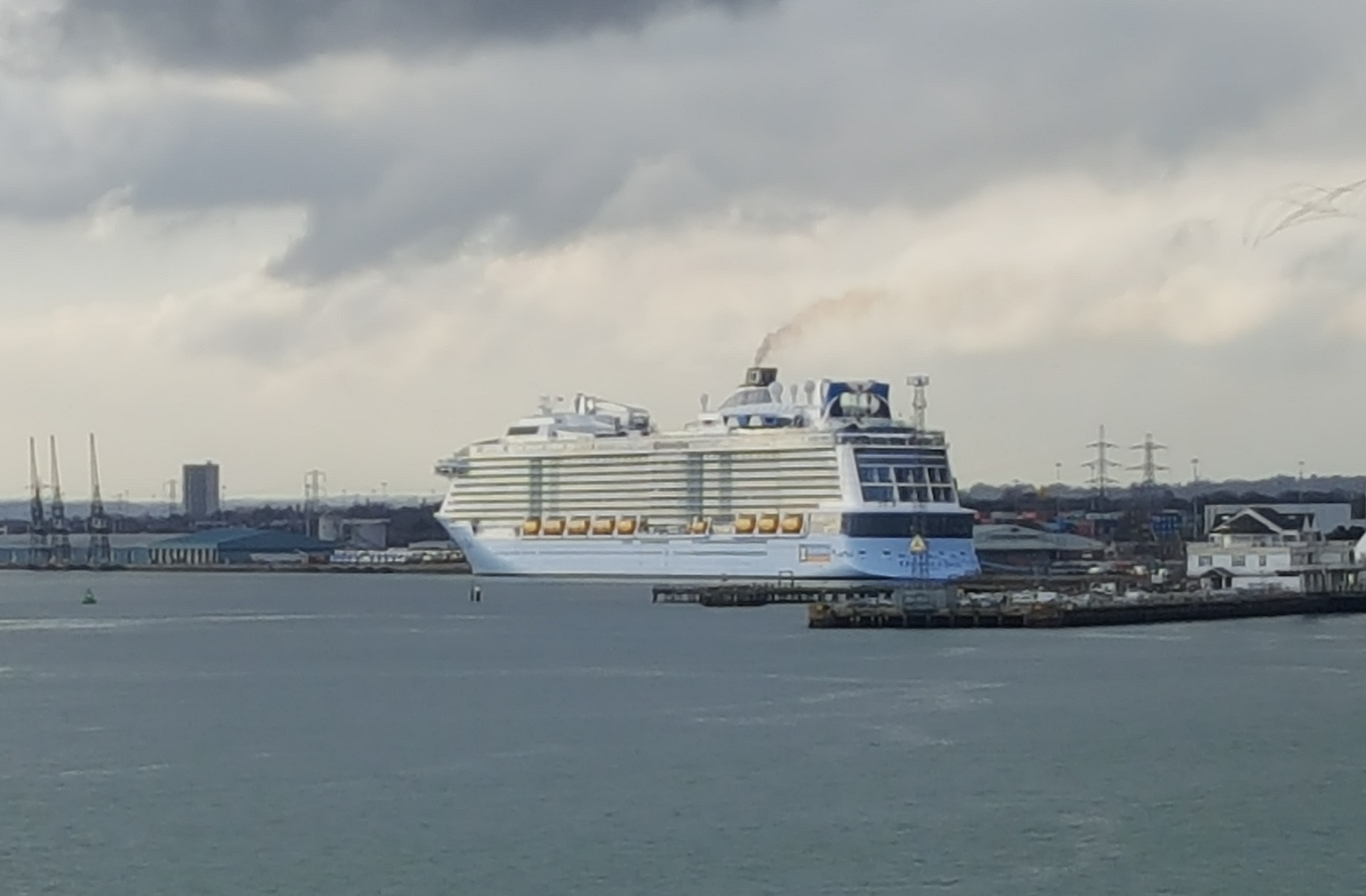Die gerade von der Meyer-Werft in Papenburg ausgelieferte und noch nicht getaufte "OVATION OF THE SEAS" im Hafen von Southampton aufgenommen von der AIDAmar am 11.04.2016
