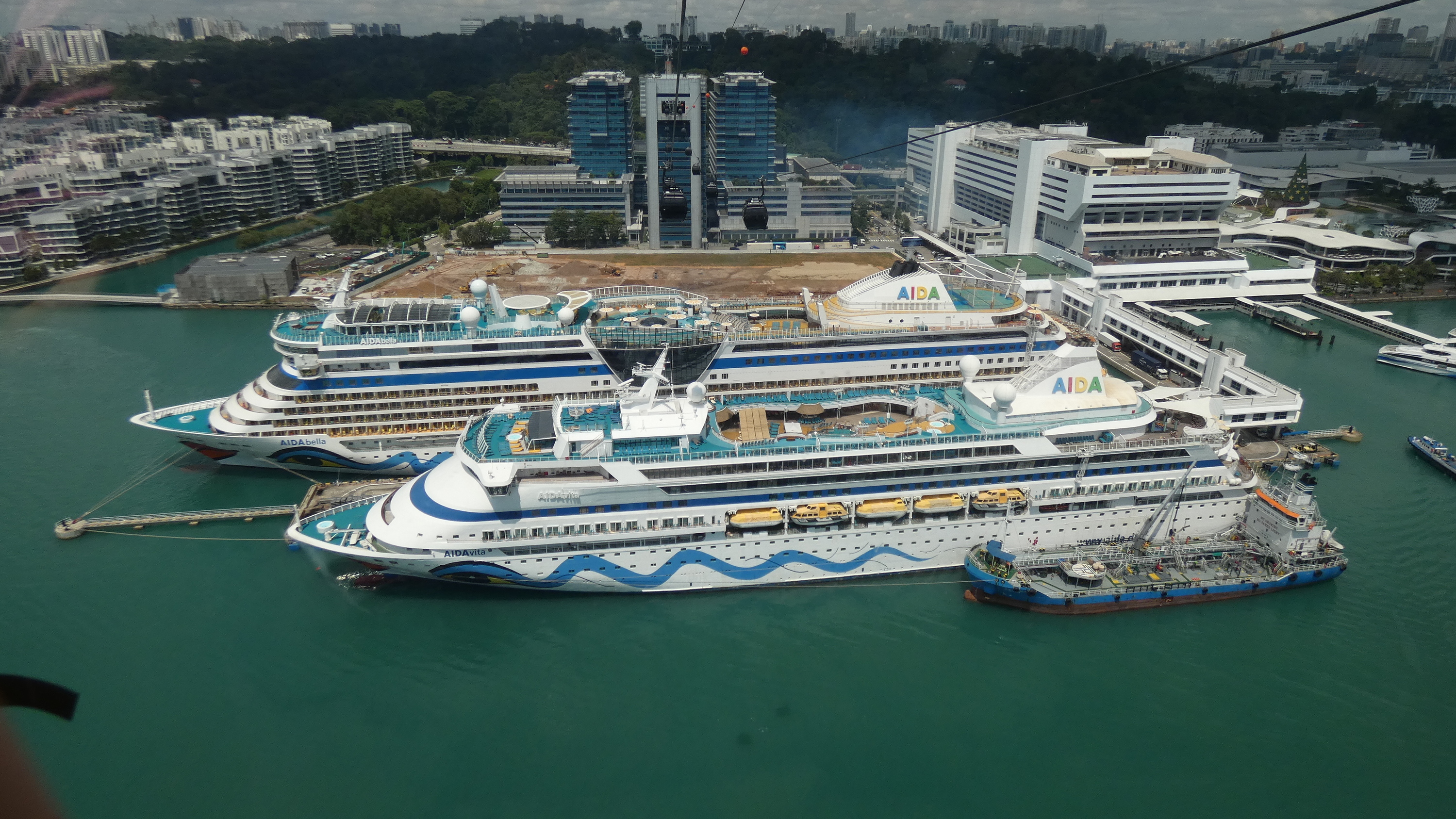 AIDAvita und AIDAbella im Hafen von Singapur, aufgenommen aus der Seilbahn