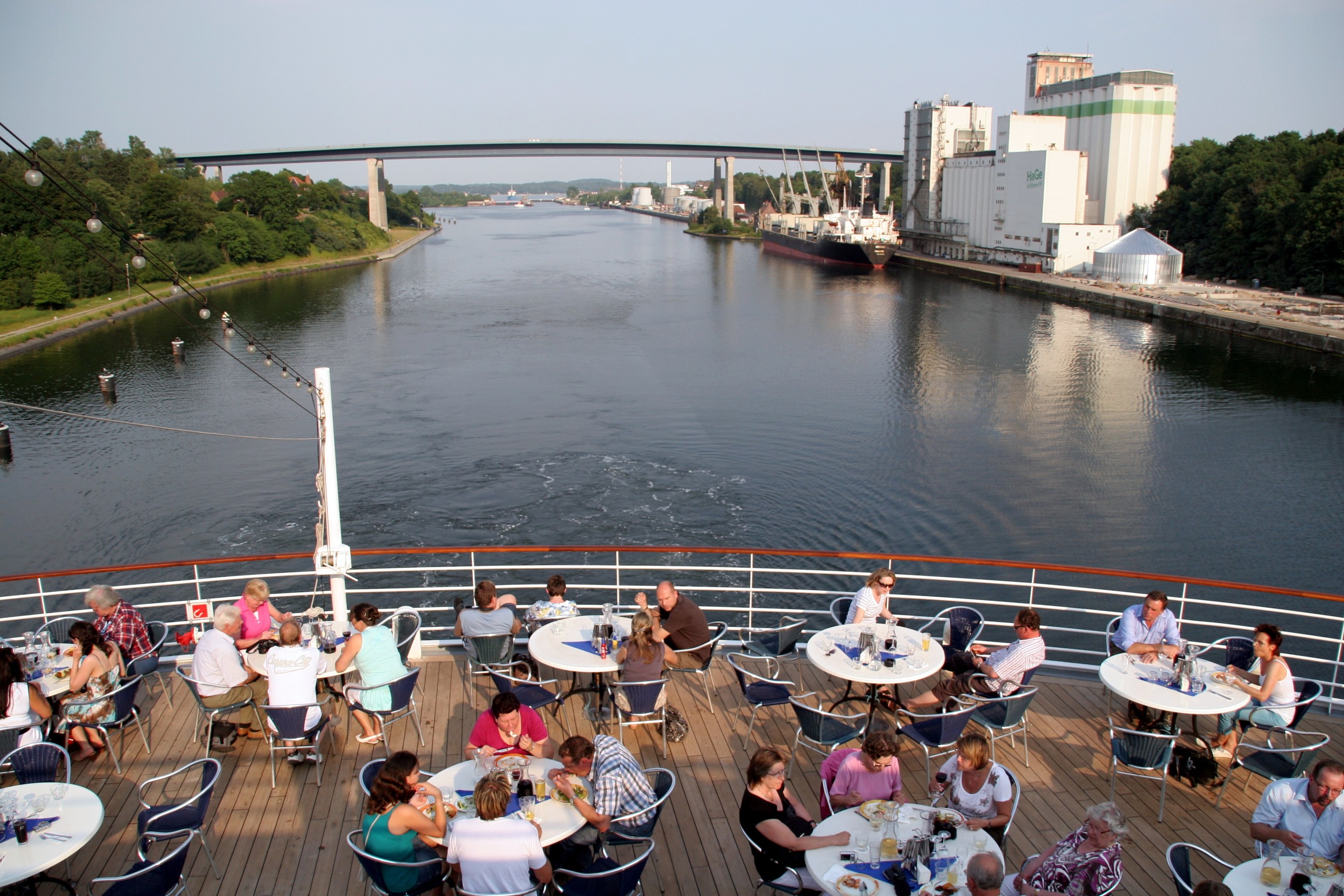 Carafahrerinnen/Carafahrer genießen auf der Außenterrasse des Calypsorestaurants das Nordostseekanalpanorama in Richtung der "Holtenauer Hochbrücke"