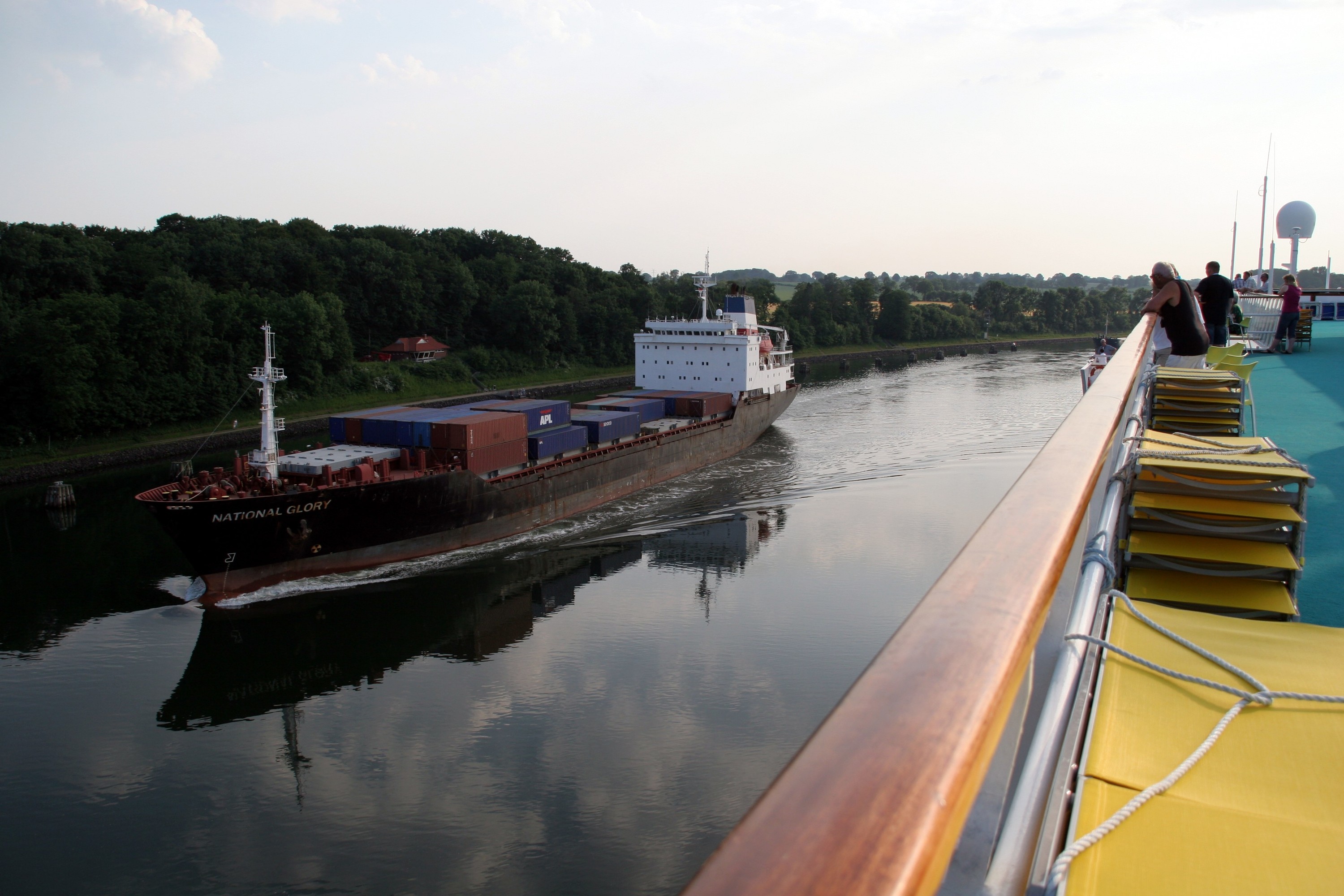 Begegnung mit einem kleinen Containerdampfer im Nordostseekanal