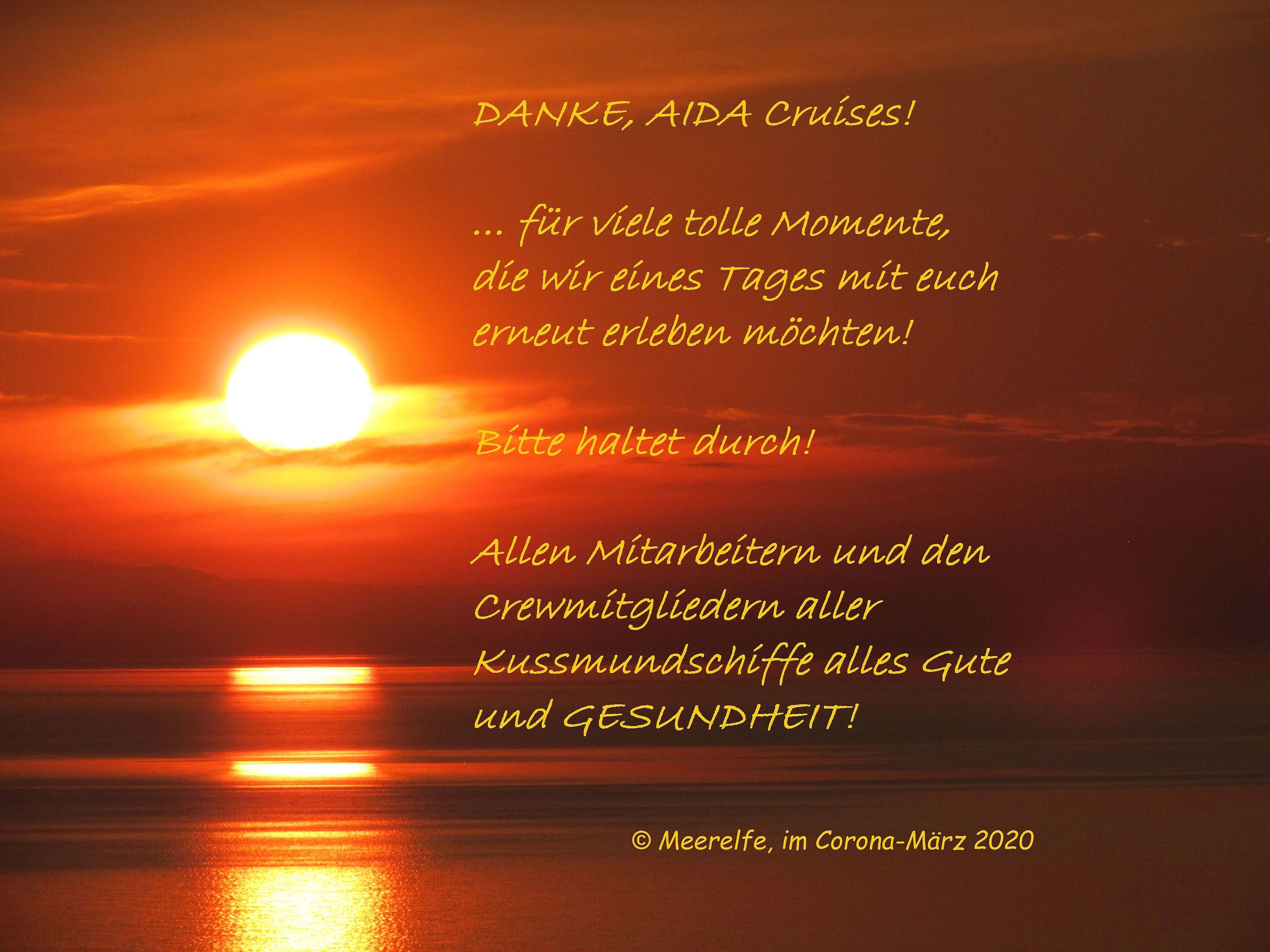 Daher ist es mir einfach ein Bedürfnis, an dieser Stelle AIDA Cruises und den Mitarbeitern, sowohl an Land als auch leider irgendwo in der Welt gestrandet – stellvertretend für alle anderen betroffenen Reedereien – nunmehr Mut zu machen angesichts der zu bewältigenden Probleme und einfach mal ein großes DANKESCHÖN zu senden!
