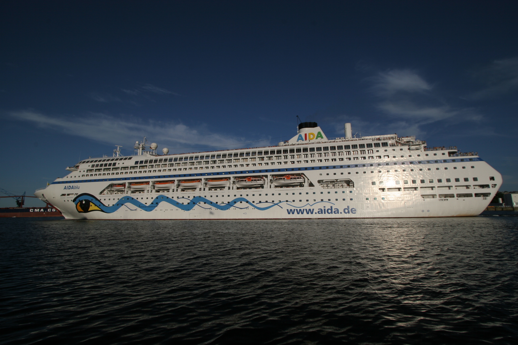 Die alte AIDAblu bei ihrem Auslaufmanöver im Juli 2006 unter einem azurblauen Himmel auf der Kieler Förde