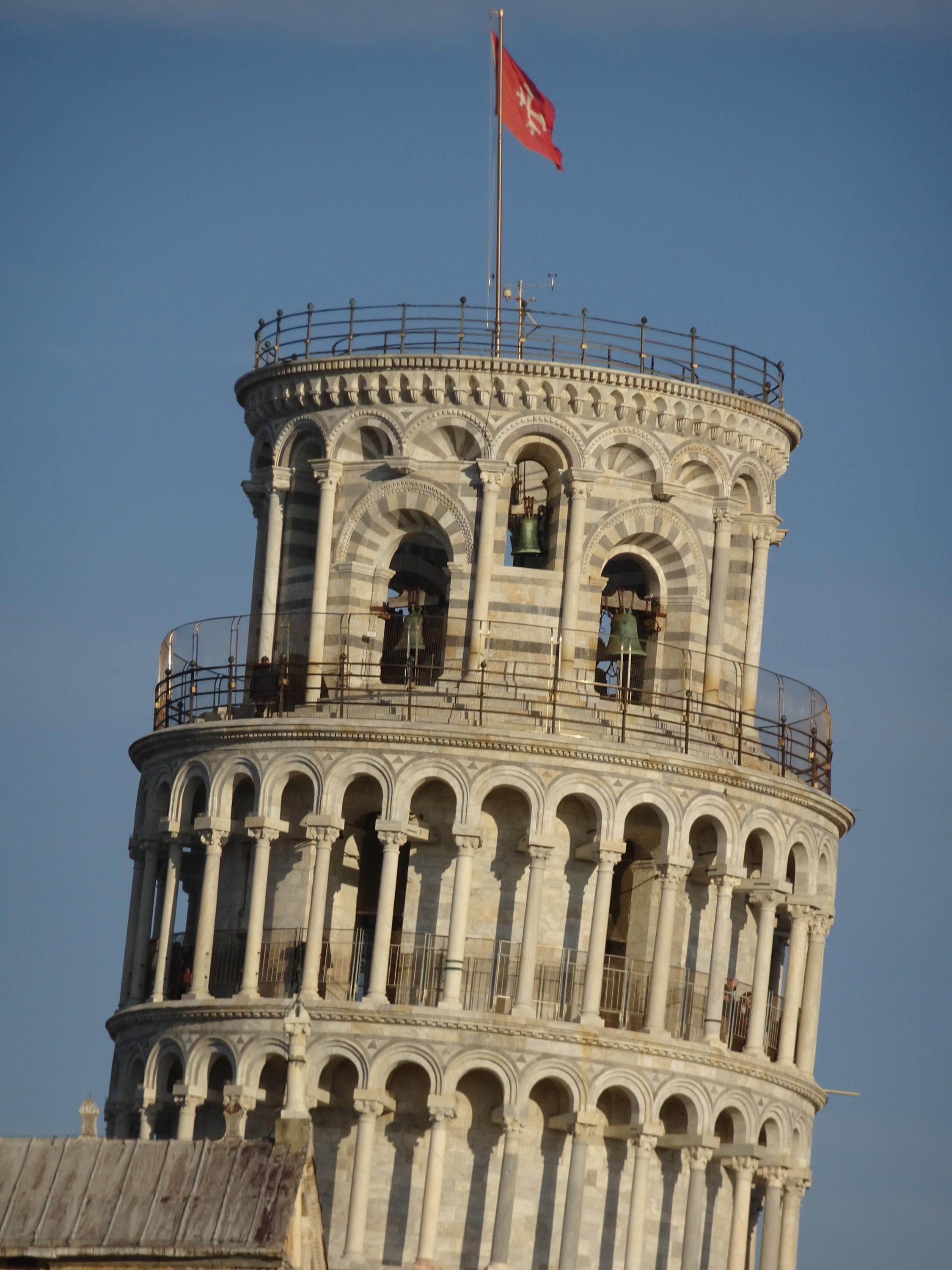 Von unserem Treffpunkt am Porta Nuova Pisa ergab sich zufällig dieser Blick auf die Turmspitze. Schön sind die senkrecht hängenden Glocken in den Fenstern zu erkennen.
