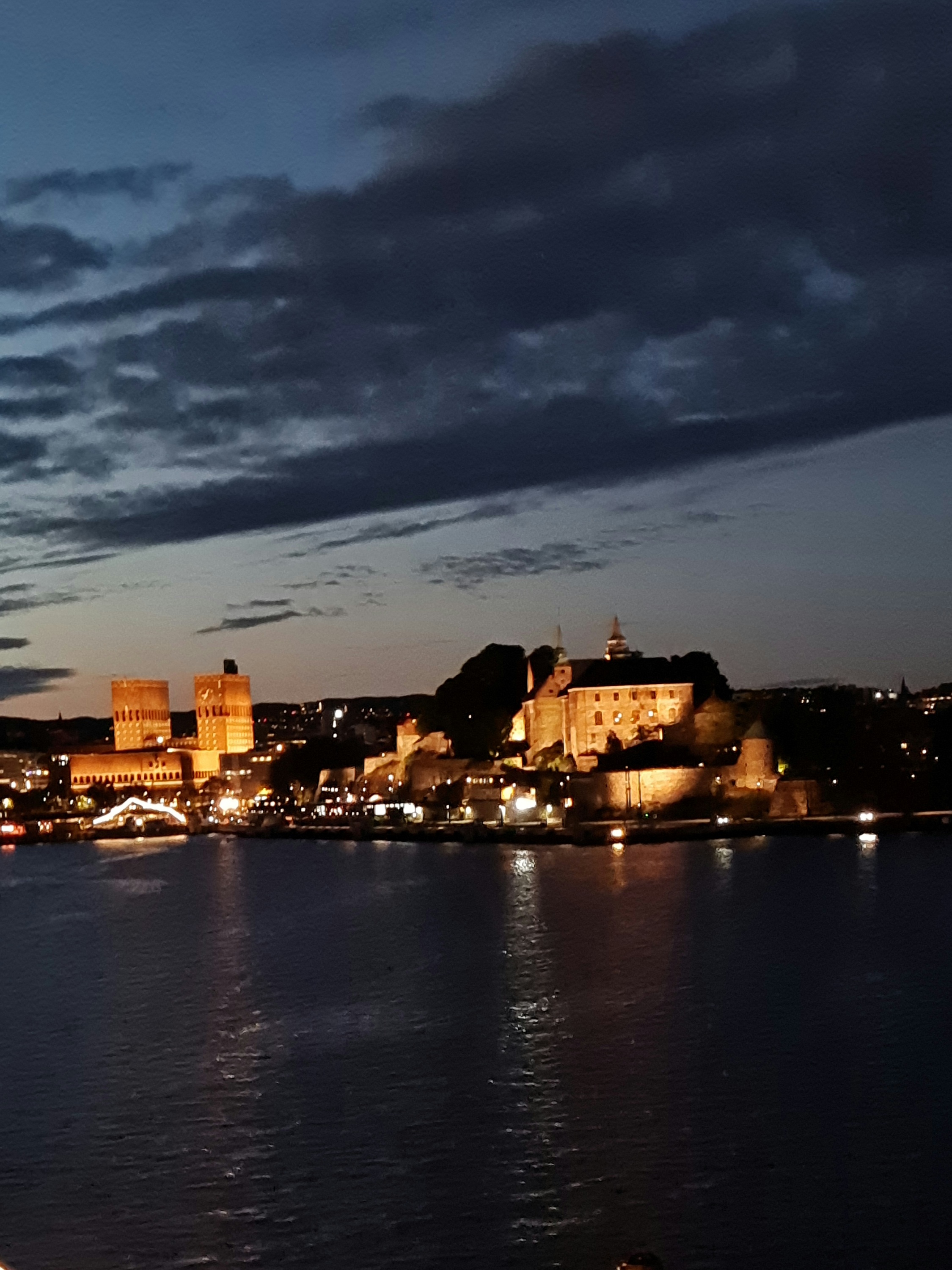wunderschönen Tag Oslo am Abend (09.2021) . Im Hintergrund das beleuchtete Rathaus von Oslo und die Festung Akershus.