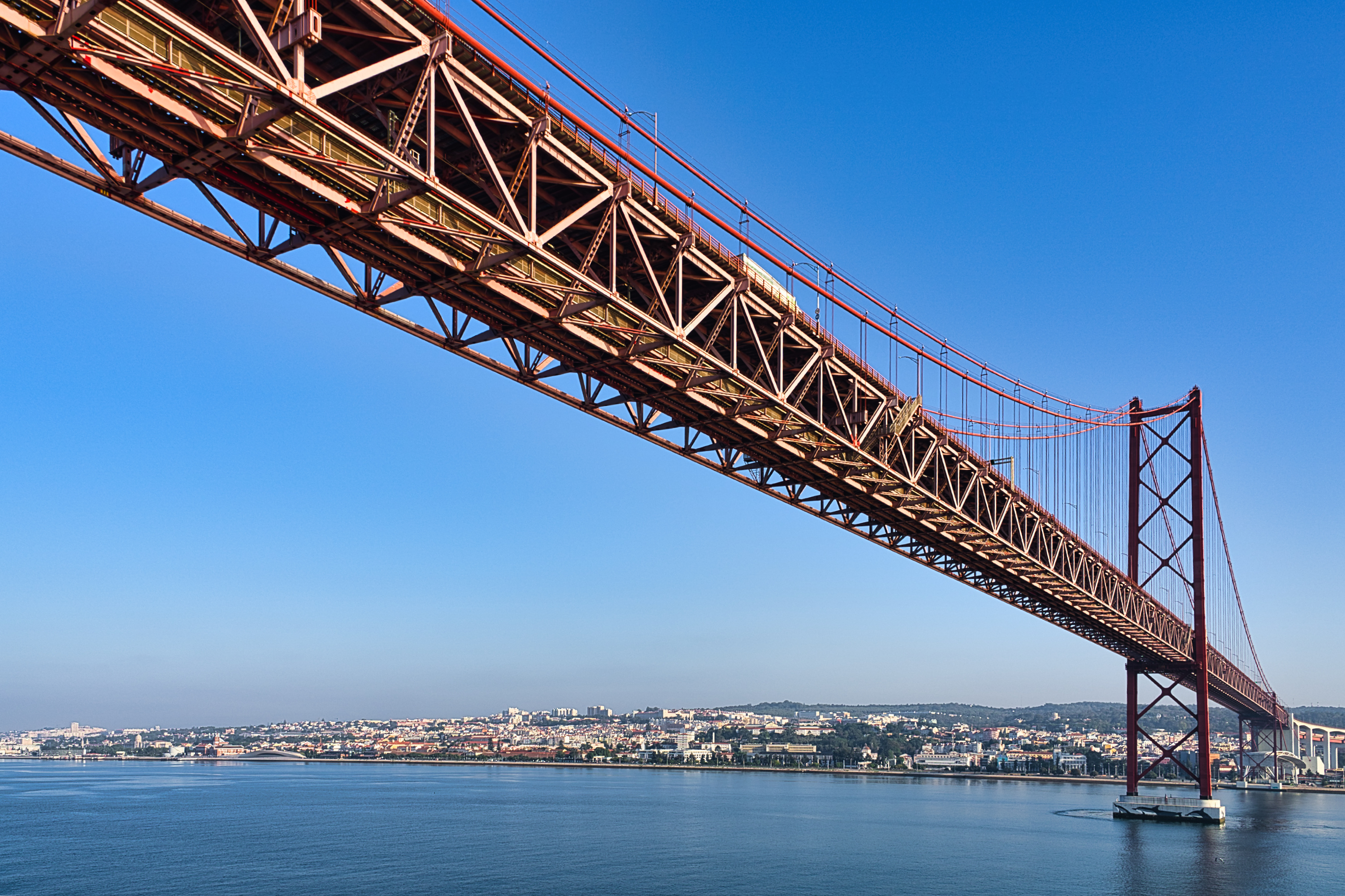 Morgentliche Passage der Ponte 25 de Abril über den Rio Tejo in Lissabon