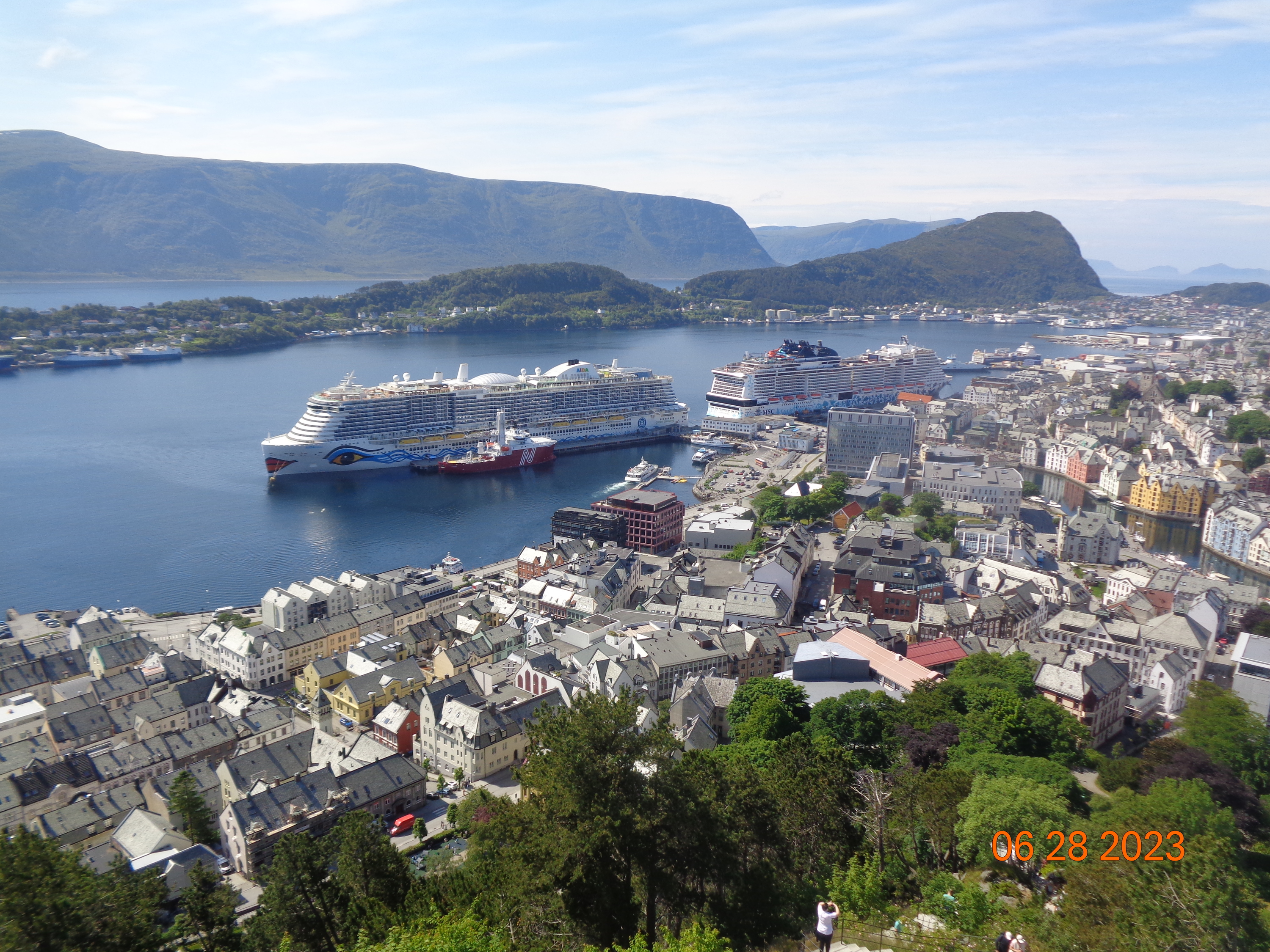 Blick vom Aksla auf AIDA Nova und MSC Euribia in Alesund