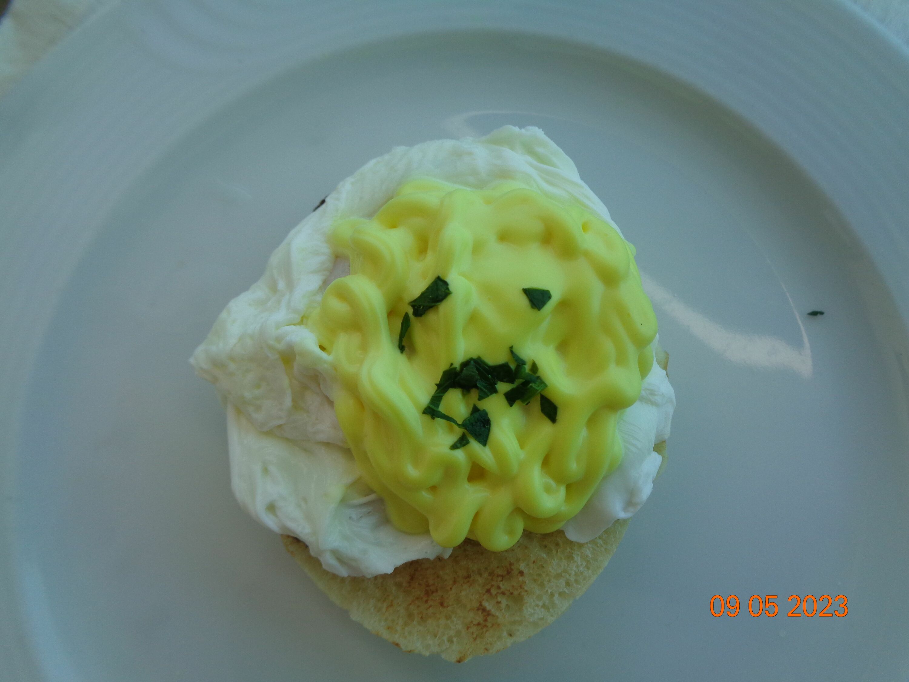 Auf der Costa Pacifica auf die Kabine geliefert 2 mal Ei Benedikt = pochierte Eier mit englischem Muffin mit Souce Hollandaise und kanadischem Schinkenspeck mit Dill. Lecker ![]()