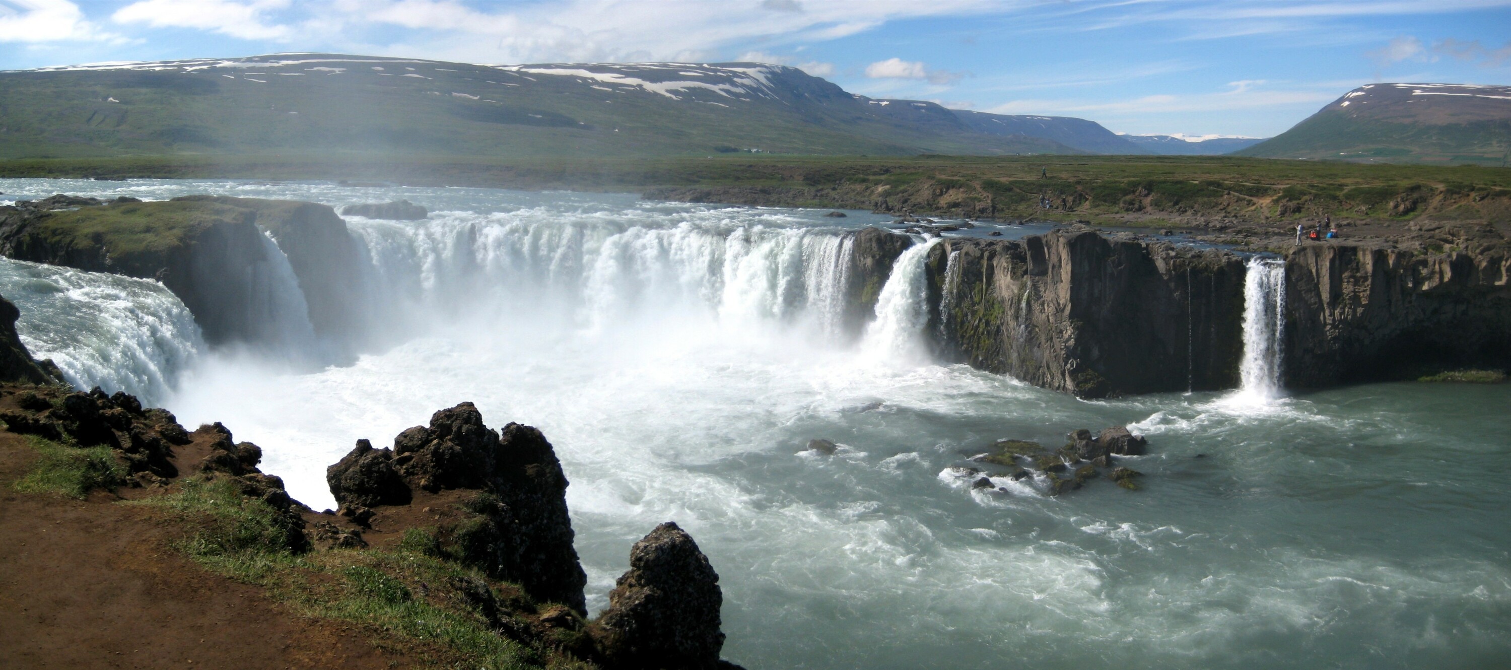 Mit dem Mietwagen fuhren wir von Akureyri über einige Zwischenziele bis zum Goðafoss, einem der bekanntesten Wasserfälle Islands.