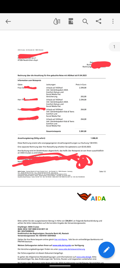 Hallo anzugeben ist eine Kabine für die Tour Winter im hohen Norden vom 01.04.23-13.04.23 mit der Aida Sol es ist gebucht eine Balkonkabine der Gesamtpreis ist 5381€ wovon schon 1288,20 angezahlt sind und wir hatten gerne 800€ wieder von uns die Reise ist allinklusive gebucht.im Anhang finden sie alles relevante zur Buchung.Bei Interesse bitte unter thorstenbuecher@googlemail.com melden