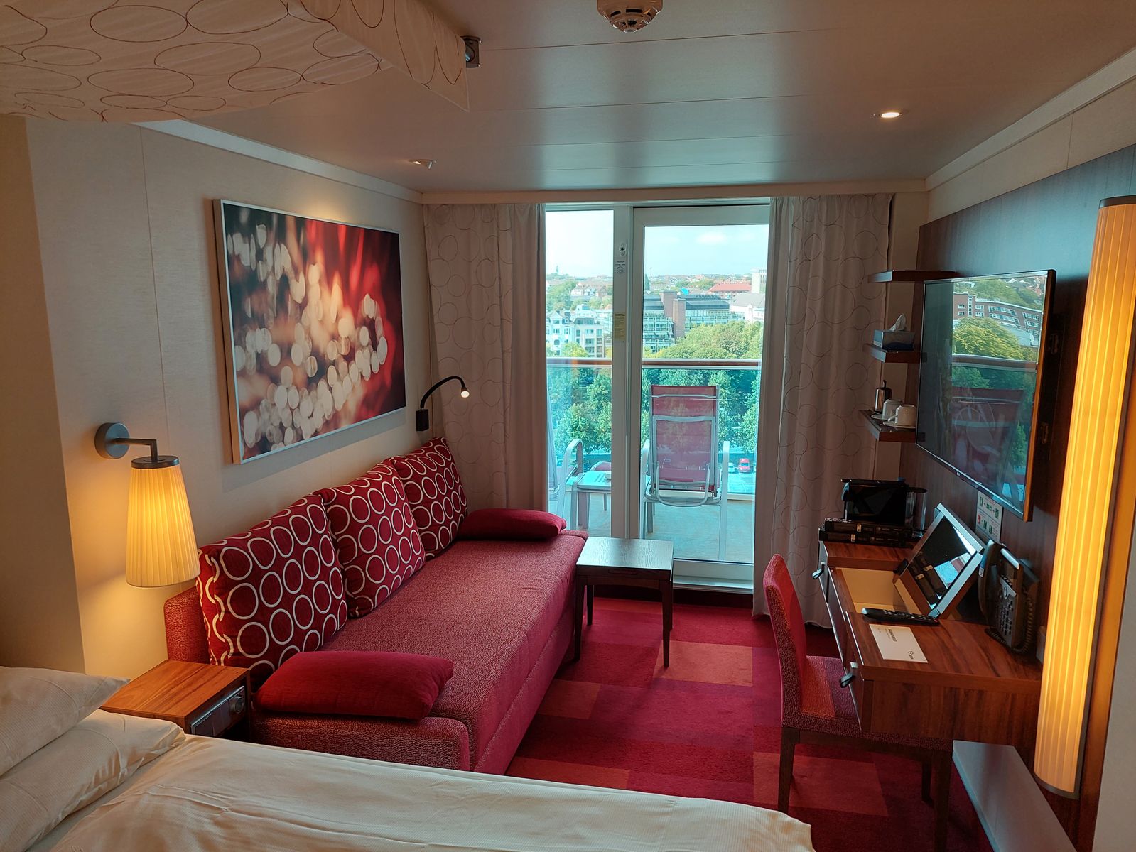 Die Kabine ist eine Verandakabine Komfort mit begehbarem Kleiderschrank. Das Fußende des Bett befindet sich in Fahrtrichtung.