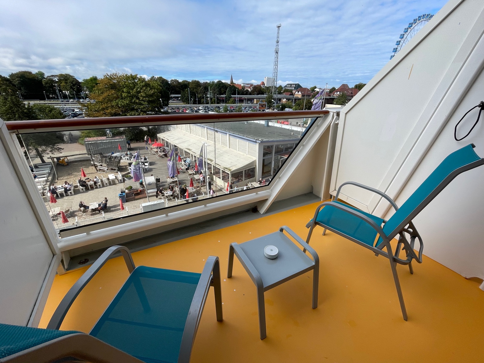 Der Balkon ist etwa doppelt so groß, wie die Balkone der darüberliegenden Kabinen (der vordere Balkonteil an der Brüstung ist allerdings nicht mehr überdacht). Ausgestattet mit zwei Stühlen, einem kleinen Metalltisch und einer Hängematte.