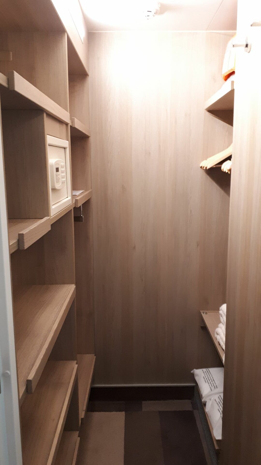 Die Kabine ansich ist von der Größe her für 3 Personen sehr gut. Bad mit Dusche und WC. Daneben der begehbare Kleiderschrank. Auch hier genügend Platz für 3 vorhanden. Sehr viele Kleiderbügel vorhanden.