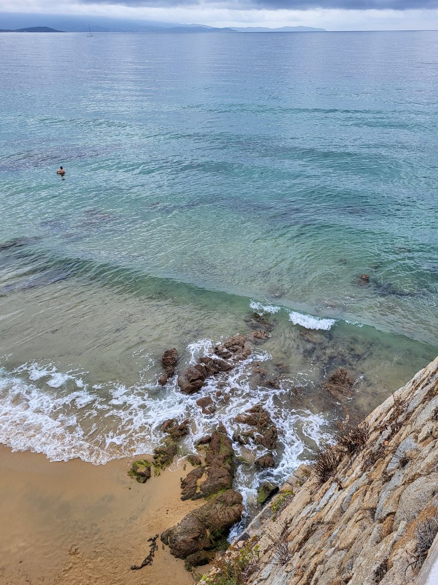 Heute in Korsika ist es bewölkt, vormittags gab es ein paar Regentropfen, am Nachmittag ein klein wenig Sonne. Wir waren am Stadtstrand, ein kurzer Spaziergang, schöner Sand und tolles türkisblaues Wasser.