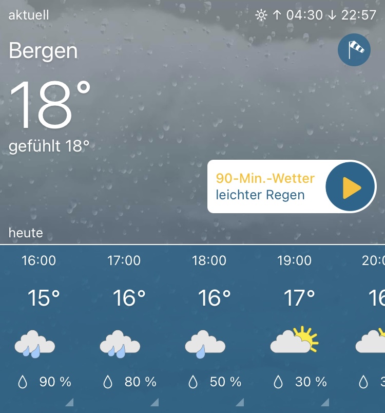 Oh ja, habe gerade mal ins Wetter reingeschaut. Ist ja eine blaue Fläche auf der Karte. Da macht Bergen ja wieder seinem Ruf alle Ehre. Schade. ![]()