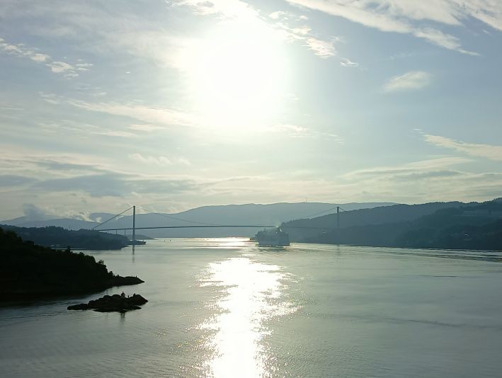 Was für ein fantastischer Tag! Bereits ab 6 Uhr morgens stand ich an Deck, um vom Bug die Aussicht vollends genießen zu können. Der Himmel wurde immer heller und schließlich begleitete die norwegische Morgensonne unsere letzten Seemeilen bis Bergen. Vor uns fuhr die ganze Zeit ein Schiff von MSC, was den Anblick der imposanten Askoy-Brücke natürlich noch abrundete.