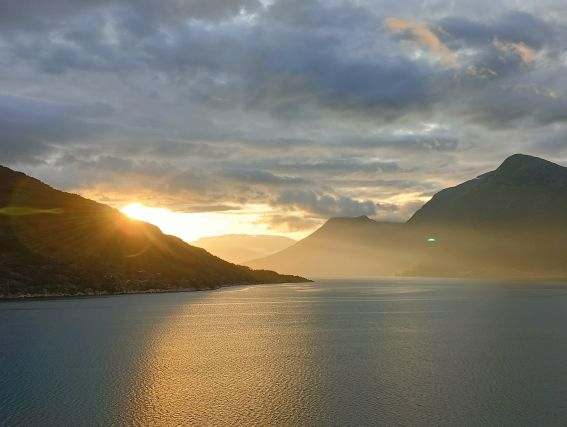 Seit kurz vor 6 Uhr fand man mich an Deck, damit ich auch so viel wie möglich der Schönheiten des Sognefjords aufnehmen kann. Es war ein Morgen mit Sonne und Wolken. Der befürchtete Regen blieb aus und so nahmen wir unsere schwimmende Parkposition auf Reede vor Vik ein. Ein tolle Kulisse erstreckte sich vor unserem Bug.