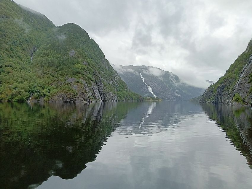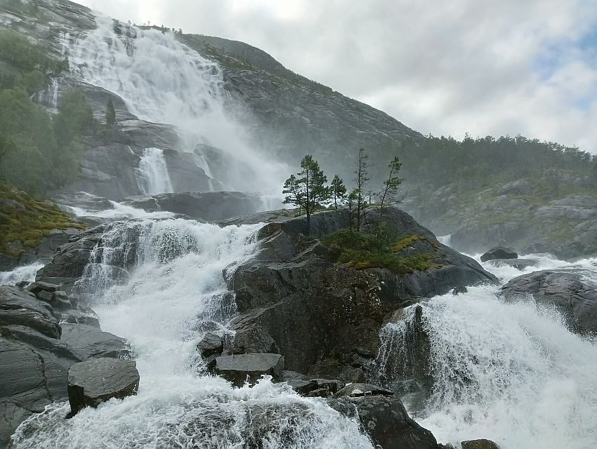 Der über 600 Meter hohe und nicht nur zu den weltweit höchsten, sondern auch zu den schönsten Wasserfällen gehörende Langfossen führte durch den Regen der vergangenen Wochen noch mehr Wasser als sonst, so dass der Kapitän unseres Ausflugsbootes aus Sicherheitsgründen nicht nahe genug herankam, um für uns Wasser zum Probieren zu schöpfen. Na ja, das war´s dann wohl mit der ewigen Jugend, Schönheit und Manneskraft.