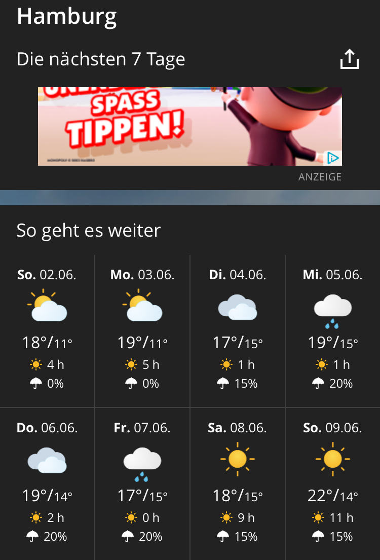 Na ja jetzt das Wetter für in 16 Tagen Vorhersagen ist ja fast wie Lotto spielen. Morgen können die schon was ganz anderes Vorhersagen. Also abwarten und Tee ( bzw. Kaffee) trinken 😉