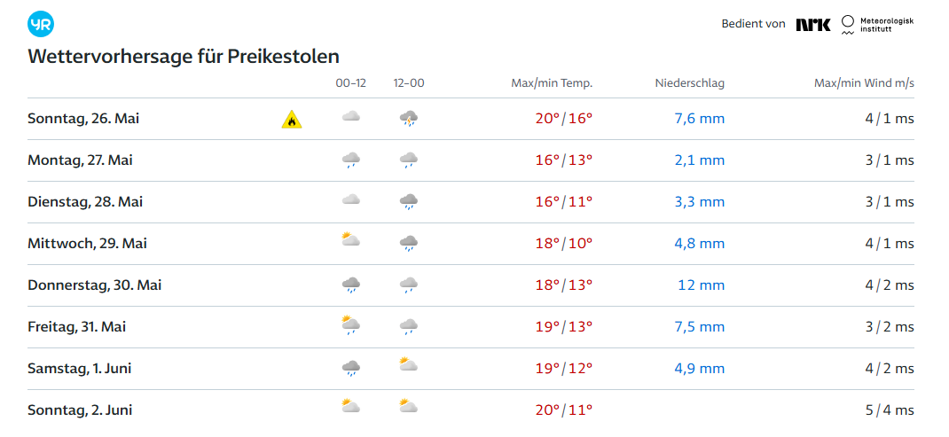 Wenn ich bei den Norwegern reinschaue prognostizieren die gerade in Ihrer 21 Tage Vorhersage für Stavanger 18 Grad und 35 %ige Regenwahrscheinlichkeit.