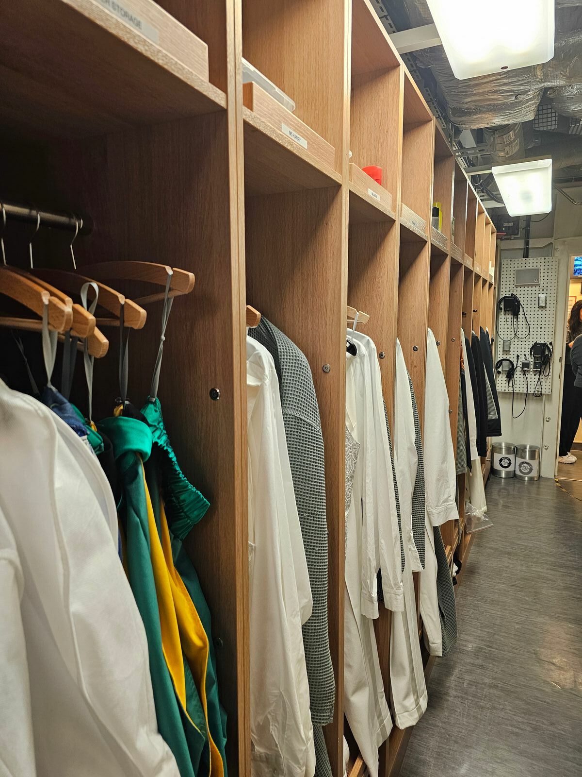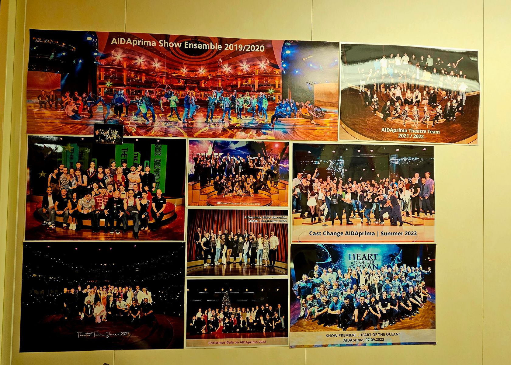 Heute morgen hatten wir dann das Suiten Treffen. Es gab zuerst kleine Canapes und reichlich Alkohol (mein Lieblingssekt B Iced Rose :stossen: ) anschließend ging es hinter die Kulissen. Es war wirklich super interessant. Wir waren 1x hinter der Bühne und dann in den Umkleideräumen. Fotos waren erlaubt. Uns wurden die u.a. Abläufe erklärt. Ich wusste z.B. gar nicht, dass die Künstler bei der Show Heart of the Ocean 1x nur 10 Sekunden Zeit zum umziehen haben. Es kümmern sich immer 3 Stylisten um die Künstler. Diese bereiten auch die ganzen Kostüme vor und waschen diese Abends wieder. Sollte was kaputt gehen, gibt es noch eine 2te Ausstattung. Wenn die Tänzer dann in Urlaub gehen und danach auf ein anderes Schiff wechseln werden u.a. die Schuhe hinterher geschickt, da diese schon eingelaufen sind. Schminken müssen sich alle selbst. Es liegt aber immer noch mal ein Make Up Handbuch an jedem Platz. Die Haare werden gemacht. Es war wirklich super interessant. Im Anschluss wurde noch ein Foto gemacht, dass später auf die Kabine gebracht wird.