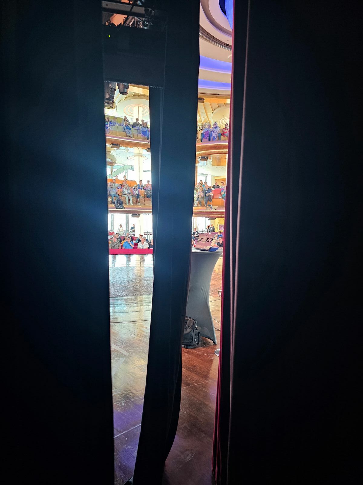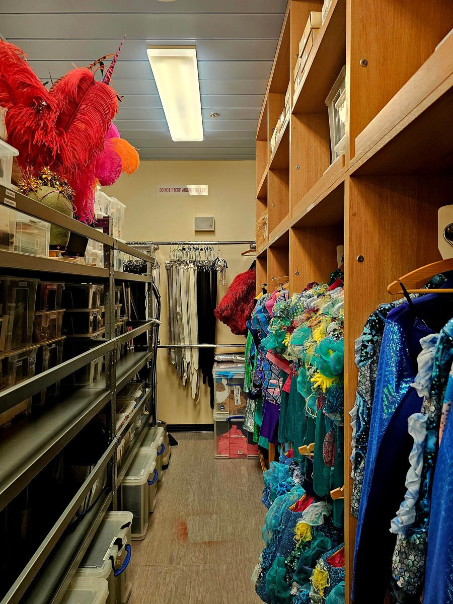 Heute morgen hatten wir dann das Suiten Treffen. Es gab zuerst kleine Canapes und reichlich Alkohol (mein Lieblingssekt B Iced Rose :stossen: ) anschließend ging es hinter die Kulissen. Es war wirklich super interessant. Wir waren 1x hinter der Bühne und dann in den Umkleideräumen. Fotos waren erlaubt. Uns wurden die u.a. Abläufe erklärt. Ich wusste z.B. gar nicht, dass die Künstler bei der Show Heart of the Ocean 1x nur 10 Sekunden Zeit zum umziehen haben. Es kümmern sich immer 3 Stylisten um die Künstler. Diese bereiten auch die ganzen Kostüme vor und waschen diese Abends wieder. Sollte was kaputt gehen, gibt es noch eine 2te Ausstattung. Wenn die Tänzer dann in Urlaub gehen und danach auf ein anderes Schiff wechseln werden u.a. die Schuhe hinterher geschickt, da diese schon eingelaufen sind. Schminken müssen sich alle selbst. Es liegt aber immer noch mal ein Make Up Handbuch an jedem Platz. Die Haare werden gemacht. Es war wirklich super interessant. Im Anschluss wurde noch ein Foto gemacht, dass später auf die Kabine gebracht wird.