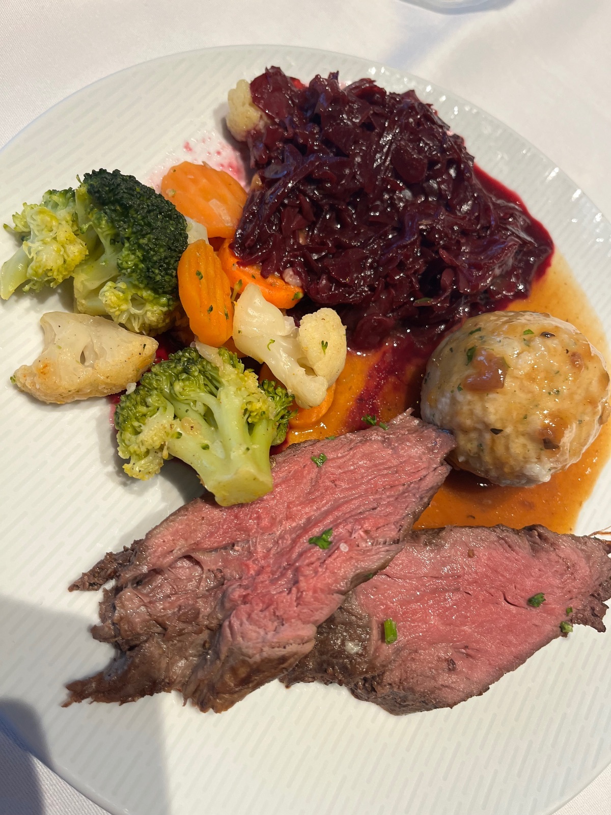 Wir waren viel im Wasser in allen Pools, waren auch öfter auf den Racer Rutschen, haben manche Shows gesehen, abends Kinofilme im Four Elements, haben im Beach Club Party gemacht… das Essen fand ich mega! Ich hatte ein bisschen bedenken, da hier im Forum so viele das Essen bemängeln. Ich verstehe nicht warum (vielleicht sagen jetzt hier manche, dass ich zu einfach gestrickt bin 🤷‍♀️). Das Rinderfilet hat mir selbst am Buffet geschmeckt (Bild siehe unten) und war zart, die Auswahl war klasse. Ich habe sicherlich in einer Woche zugenommen (aber wiege mich nicht 🤪). Das Rinderfilet im French Kiss war allerdings ein Gedicht!!!