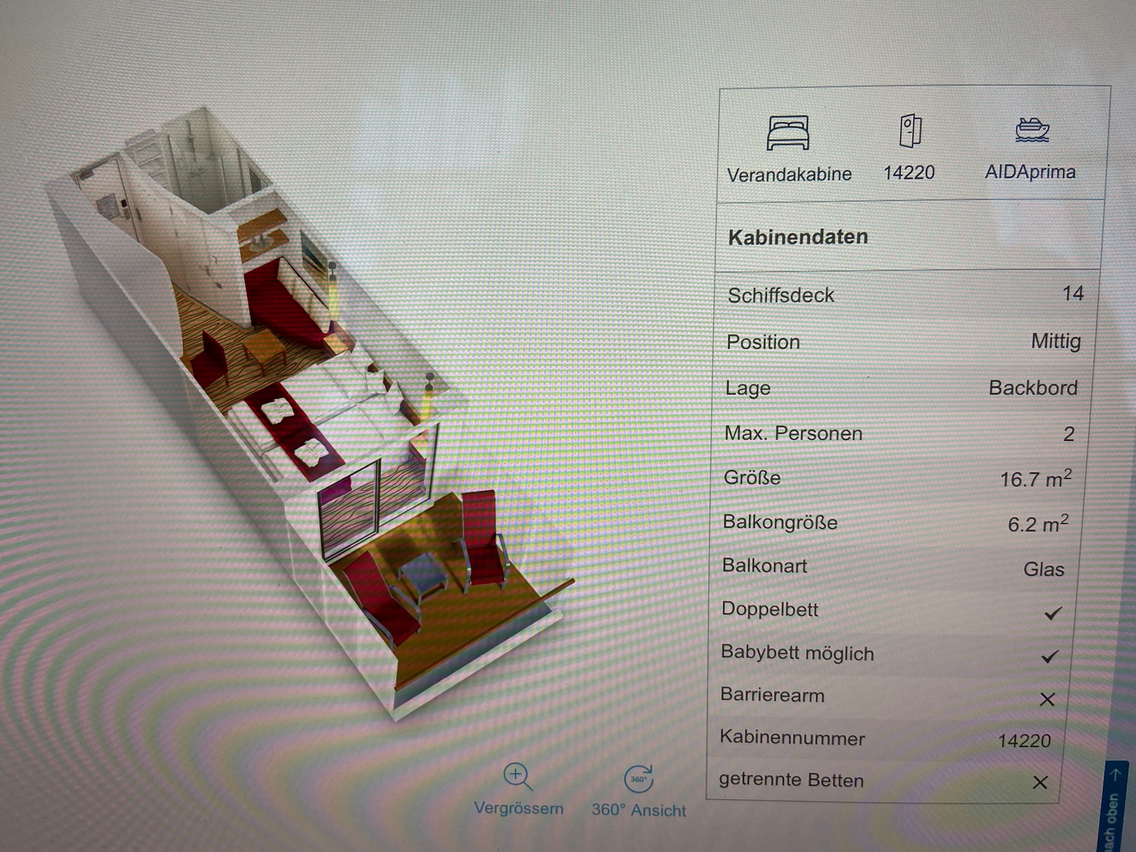 Es ist mein geliebtes Deck 6 geworden, Steuerbord, aber recht weit vorne, 630x, bin aber sehr zufrieden.