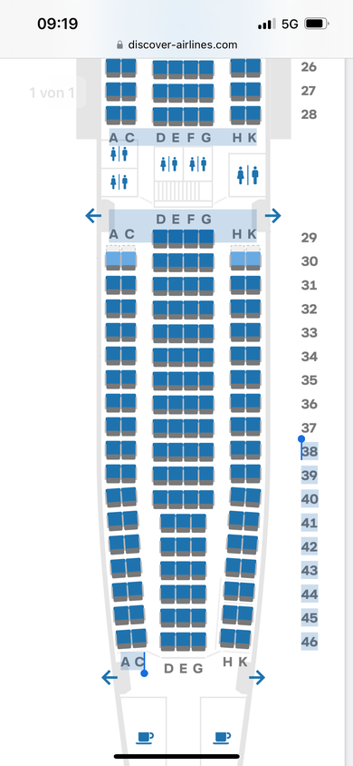 Wir fliegen mit Discover. In den Reihen 41-46 fehlt der 4. Sitzplatz in der Mitte. Also es sind 2 Sitzplätze neben einander, dann ein Platz ohne Sessel und dann wieder ein Sitzplatz. Ist schon wer mit Discover geflogen und kann mir sagen warum das so ist. Wir sind zu dritt und würden gerne in einer 3er Reihe sitzen.